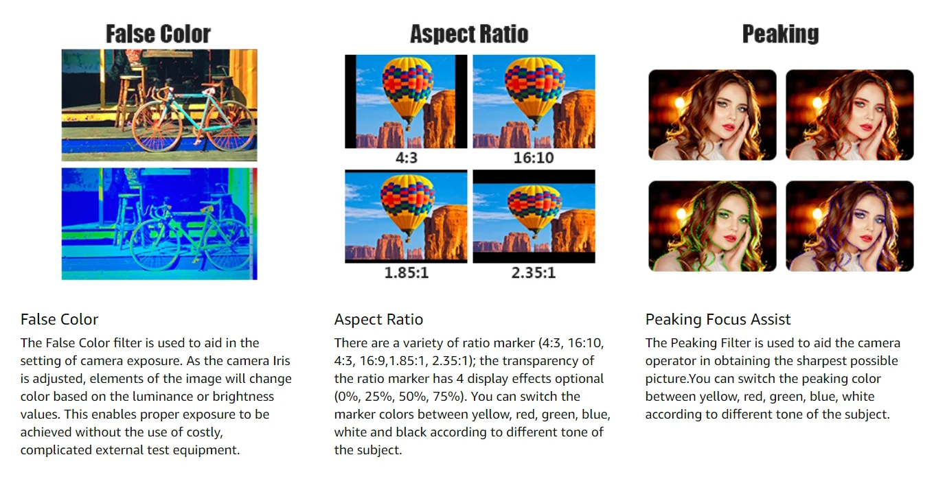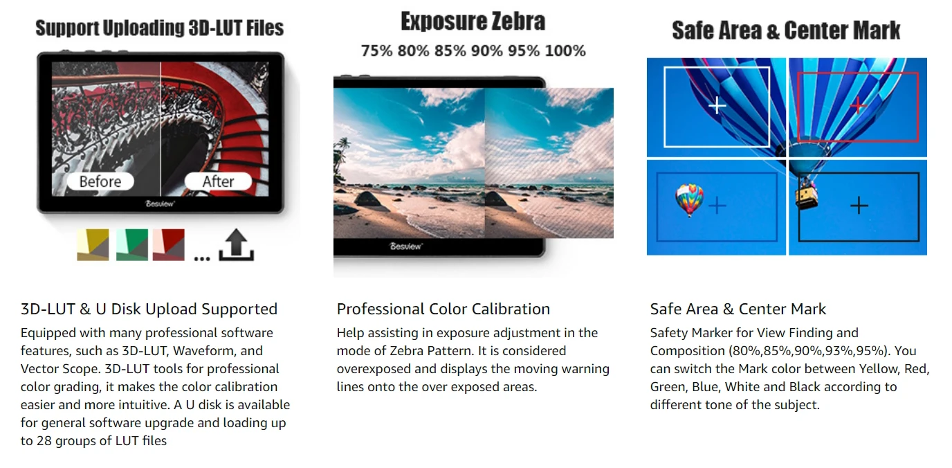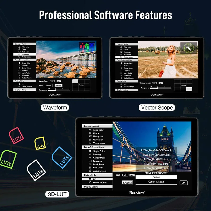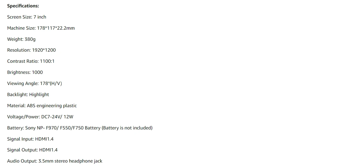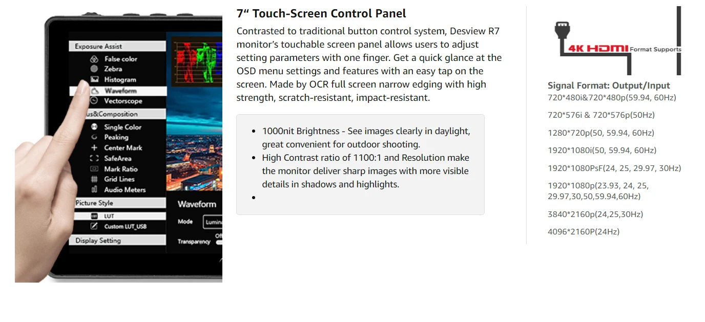 【 7 "сенсорный экран-Экран Управление Панель 】Contrasted традиционных Кнопка Управление системы, Bestview R7 мониторов и прочих факторов осязаемый Экран Панель позволяет пользователям регулировать параметры настройки одним движением пальца. Быстро взгляните на настройки меню OSD и функции с помощью легкого нажатия на экран. Изготовлен из узкой окантовки с полным экраном OCR с высокой прочностью, устойчивостью к царапинам, ударопрочностью. 【 Яркость дневного света 1000nit 】монитор desview R7 имеет потрясающую яркость 1000nit, Фотографы могут четко видеть изображения при дневном свете, отлично подходит для наружной съемки. Высокий коэффициент контрастности 1100:1 и 1920*1200 позволяет монитору получать четкие изображения с более заметными деталями в тени и бликах. 【Поддержка 4K HDMI вход/выход без delay】поддержка практически всех форматов 4K, монитор Bestview R7 может быть подключен непосредственно к любым DSLR или HD/4K видеокамерам, и выход HDMI сигналов без задержки передачи. Вы можете смотреть кадры синхронно на нашем мониторе. 【 3D-LUT, Waveform и Vector Scope】Desview R7 монитор оснащен множеством профессиональных функций программного обеспечения, таких как 3D-LUT, волновод (мониторинг насыщенности цвета) и векторный объем (амплитуда сигнала мониторинга). 3D-LUT инструменты для профессиональной сортировки цветов, это делает калибровку цвета проще и интуитивнее. U диск доступен для общего обновления программного обеспечения и загрузки до 28 групп файлов LUT. 【Mini аксессуары для холодной обуви 】мини-Холодный башмак прилагается к монитору. Поддерживая вращение на 180 ° по вертикали, этот универсальный Холодный башмак может легко подключить монитор к большинству камер, видеокамер и стабилизаторов и т. д. идеально подходит для кинематографистов, интервьюеров и видеоблоггеров.