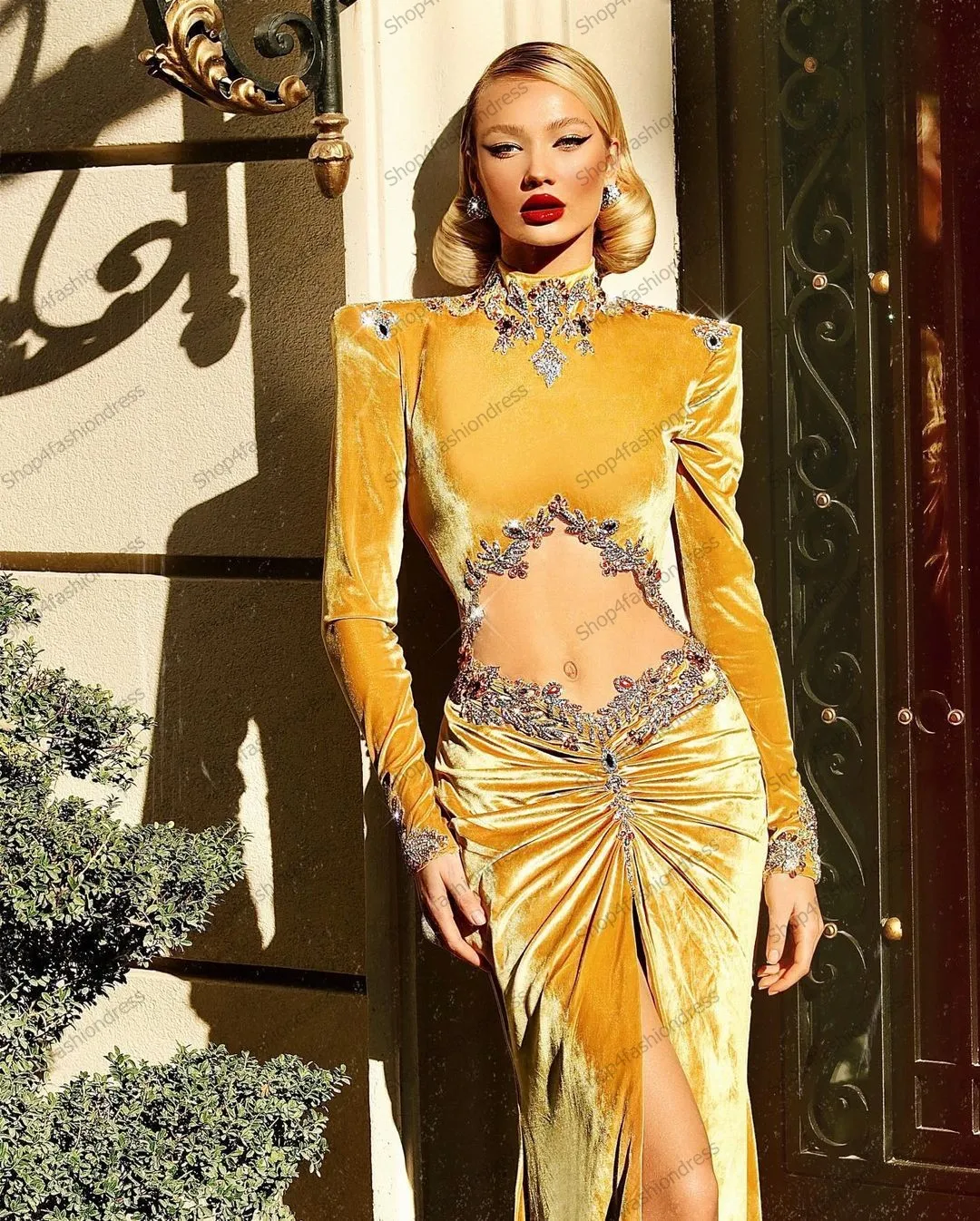 Элегантные золотистые женские вечерние платья с высоким воротником и длинными рукавами, украшенные бисером, с разрезом, платье для выпускного вечера
