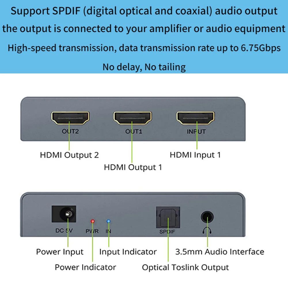 Этот новый HDMI аудио экстрактор может поддерживать 3D \ 4KX2K и он позволяет 1 HDMI вход и 2 HDMI выход подключен к 1 HD дисплей (как телевизор или проектор) И извлеките аудио в SPDIF audio out + 3,5 мм Stereo audio out. Не только для того, чтобы соответствовать идеальному изображению HDTV, но и для удовлетворения потребностей энтузиастов в аудио.