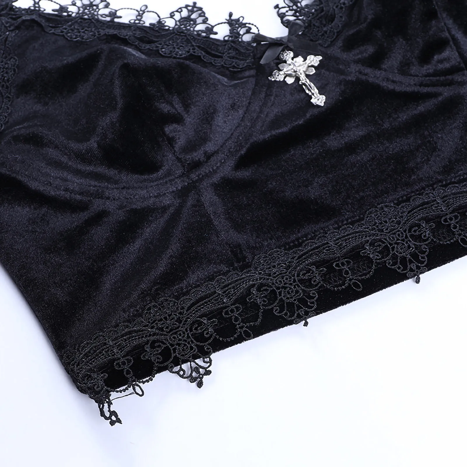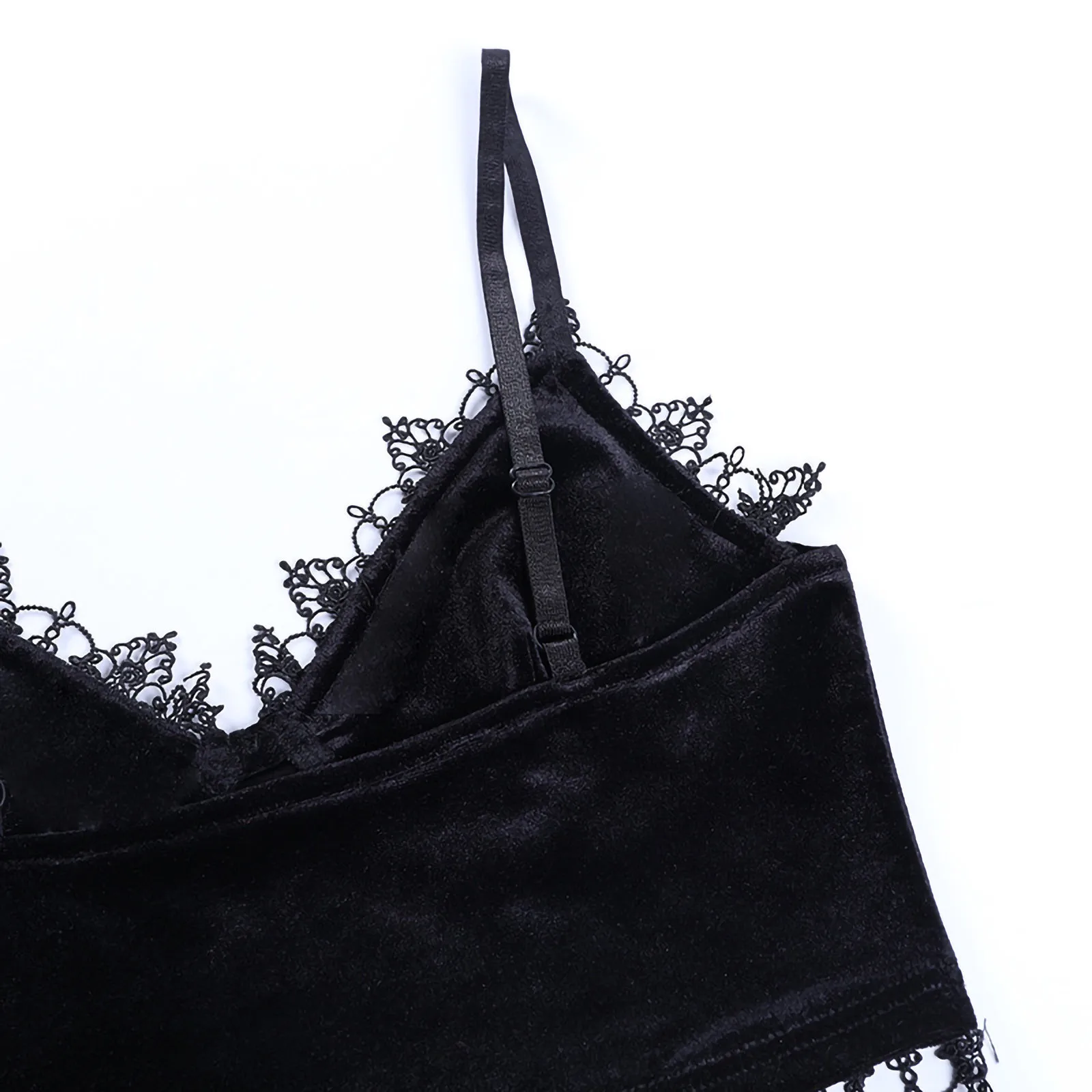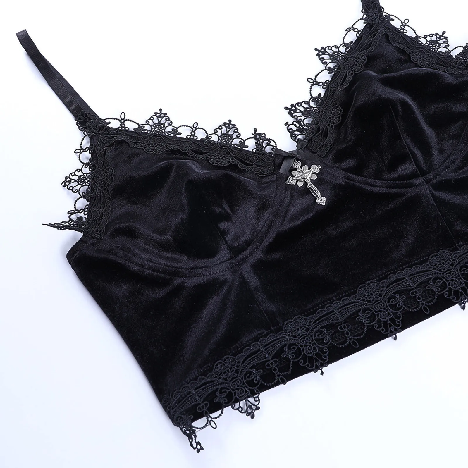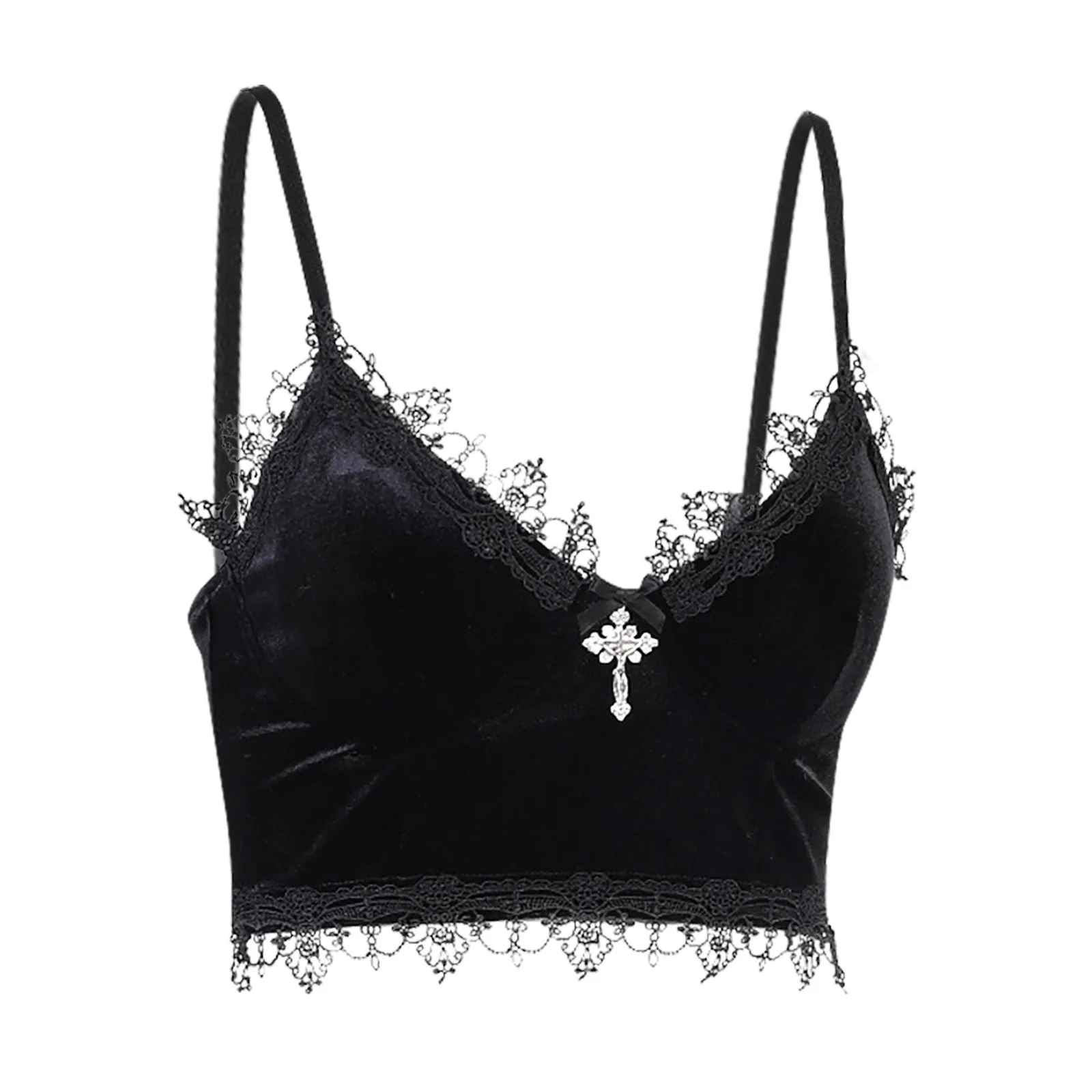 Женский укороченный топ бархатный Y2K Mall, черный кружевной топ с отделкой эмо, альтернативный эстетический укороченный топ с открытой спиной, сексуальные майки на бретелях
