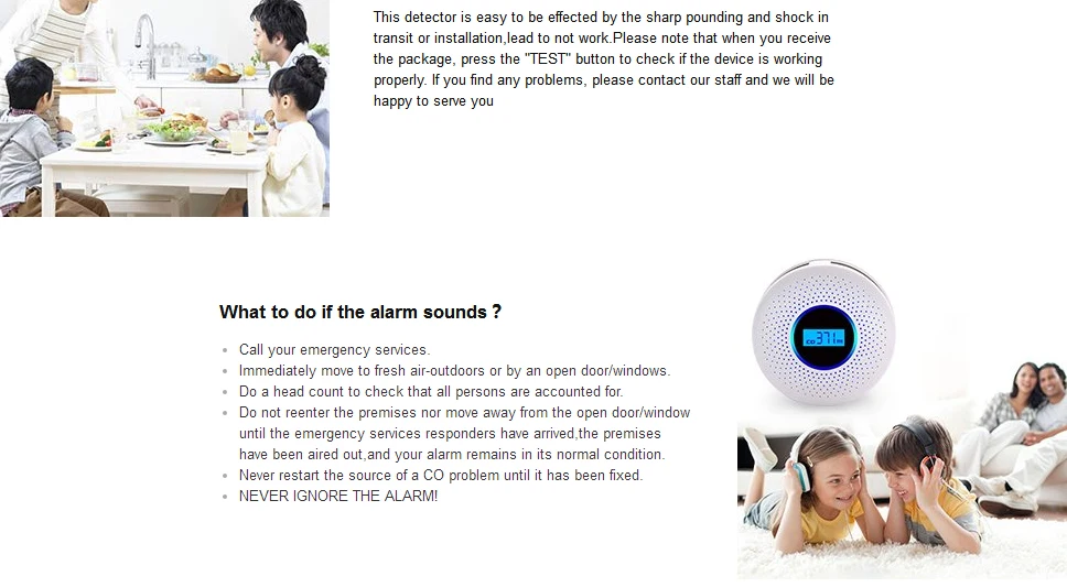 1. Материал: пластик 2. Цвет: белый 3. Датчик: Электрохимический датчик окиси углерода и Инфракрасный фотоэлектрический датчик 4. Рабочая температура: 0-50 °C 5. Рабочая влажность: относительная влажность 10%-95% 6. Содержание окиси углерода при обнаружении газа: 000-999ppm 7. Чувствительность дыма: 0.1% дБ/m-9.9 % дБ/м 8. Мощность: 3 батареи AA1.5V (не входят в комплект) 9. Будильник: ЖК-дисплей, звук и светильник 10. Дисплей батареи: сигнал тревоги низкого заряда батареи 11. Размер: 104 мм (диаметр) * 35 мм (высота) 12. Ток покоя: <80uA 13. Ток сигнала тревоги: <30 мА 14. Звуковая сигнализация:>80 дБ 15. Область защиты детектора дыма: когда высота пространства составляет от 6 до 12 метров, площадь защиты одного детектора составляет 80 квадратных метров для общей площадки защиты; когда высота пространства составляет 6 метров или меньше, площадь защиты составляет 60 квадратных метров. 16. Область применения: барбекю магазин, кухня, спальня, гостиная, парковка, школа, библиотека