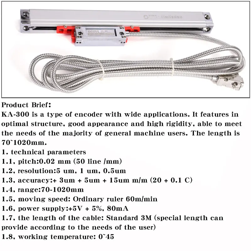 KA-300-это тип кодировщика с широкими приложениями. Он отличается оптимальной структурой, хорошим внешним видом и высокой жесткостью, способной удовлетворить потребности большинства пользователей общих машин. Длина 70 ~ 1020 мм.1. Технические параметры1,1, шаг: 0,02 мм (50 линий/мм)1,2, разрешение: 5 мкм, 1 мкм, 0,5 мкм1,3, Точность: + 3um + 5um + 15um м/м (20 + 0,1 C)1,4, диапазон: 70-1020 мм1,5, скорость движения: обычная линейка 60 м/мин1,6, Источник питания: + 5 В + 5%, 80 мА1,7, длина кабеля: Стандартный 3 м (специальная длина может обеспечить в соответствии с потребностями пользователя)1,8, Рабочая температура: 0 ~ 45