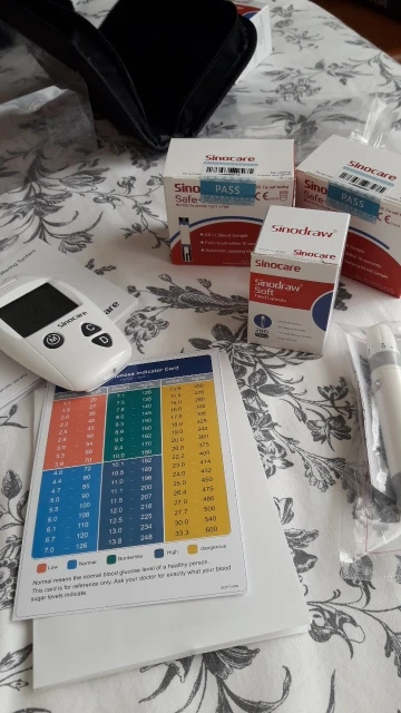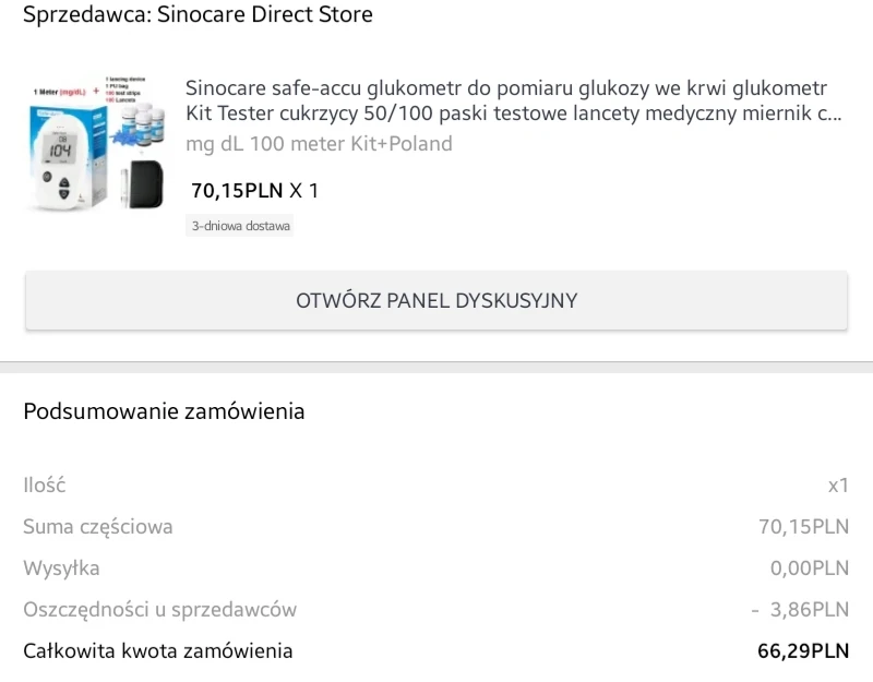 Towar zgodny z opisem i zdjęciami sprzedającego. Dobrze zapakowany. Szybka dostawa w 3 dni:-) Dostawa z Polski przez kuriera GLS. Glukometr oceniam bardzo dobrze, nakłuwacz oceniam pozytywnie (szału nie ma, ale działa na razie dobrze) Pomiar wiarygodny. Łatwość obsługi. Wyśmienita cena, ja dałem 66,29 PLN za wersję 100 pasków. Teraz kupiłem kolejne 400 pasków z lancetami za kwotę 130 PLN. Polecam Sinocare safe-accu, sklep warto wybrać z rozwagą bo ofert i cen za ten sam produkt jest sporo.
