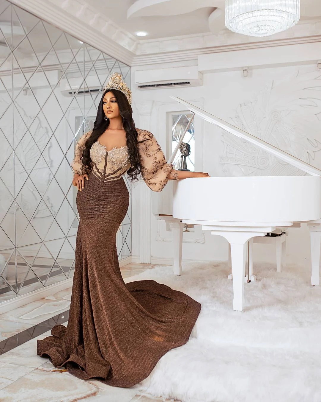 Шикарное длинное вечернее платье-русалка, с рукавами длинные платья для выпускного бала и шлейфом, кружевные аппликации на заказ, коричневое, Aso Ebi, 2021