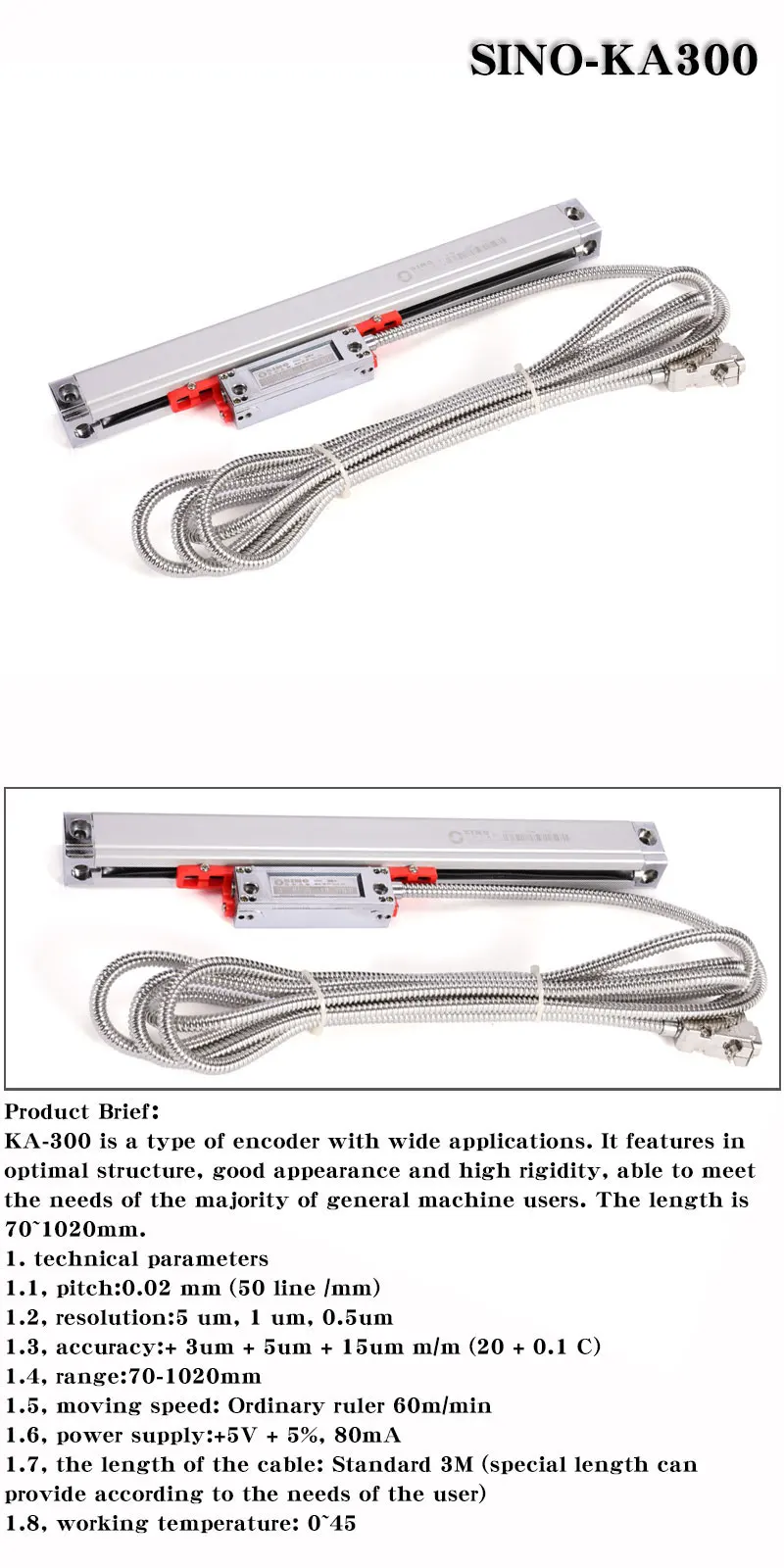 KA-300-это тип кодировщика с широкими приложениями. Он отличается оптимальной структурой, хорошим внешним видом и высокой жесткостью, способной удовлетворить потребности большинства пользователей общих машин. Длина 70 ~ 1020 мм.1. Технические параметры1,1, шаг: 0,02 мм (50 линий/мм)1,2, разрешение: 5 мкм, 1 мкм, 0,5 мкм1,3, Точность: + 3um + 5um + 15um м/м (20 + 0,1 C)1,4, диапазон: 70-1020 мм1,5, скорость движения: обычная линейка 60 м/мин1,6, Источник питания: + 5 В + 5%, 80 мА1,7, длина кабеля: Стандартный 3 м (специальная длина может обеспечить в соответствии с потребностями пользователя)1,8, Рабочая температура: 0 ~ 45