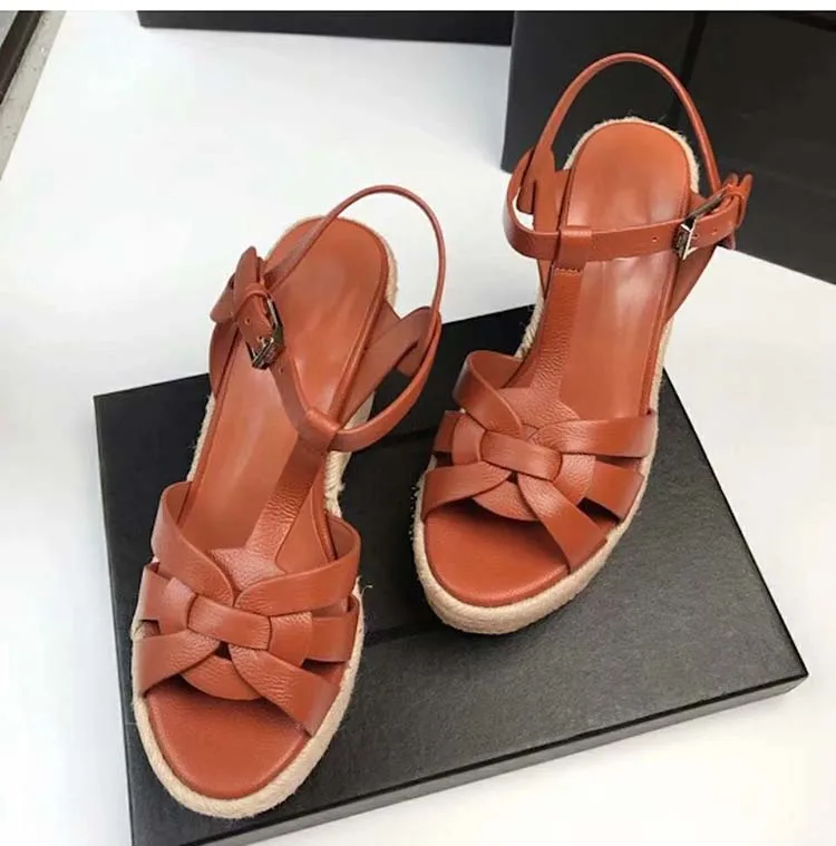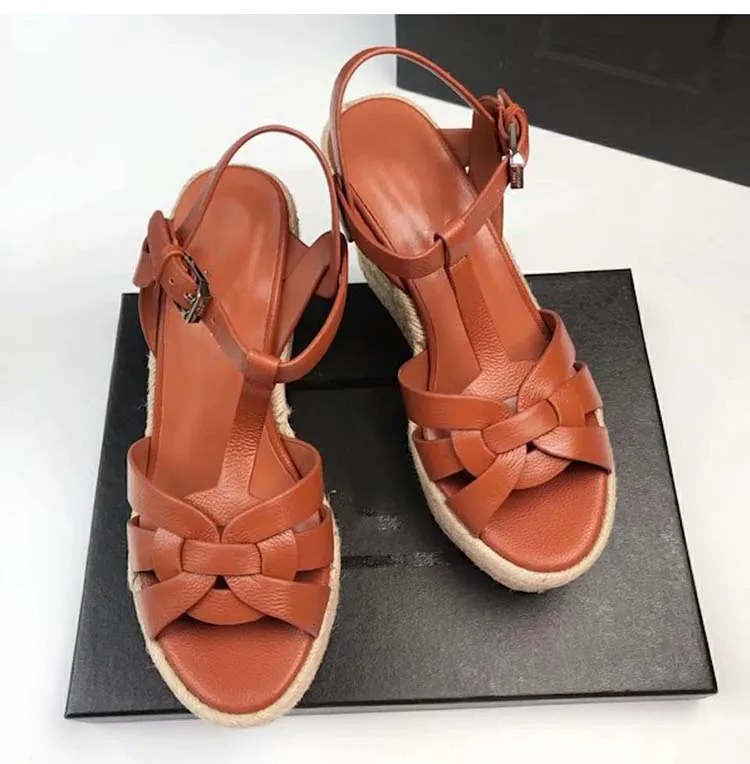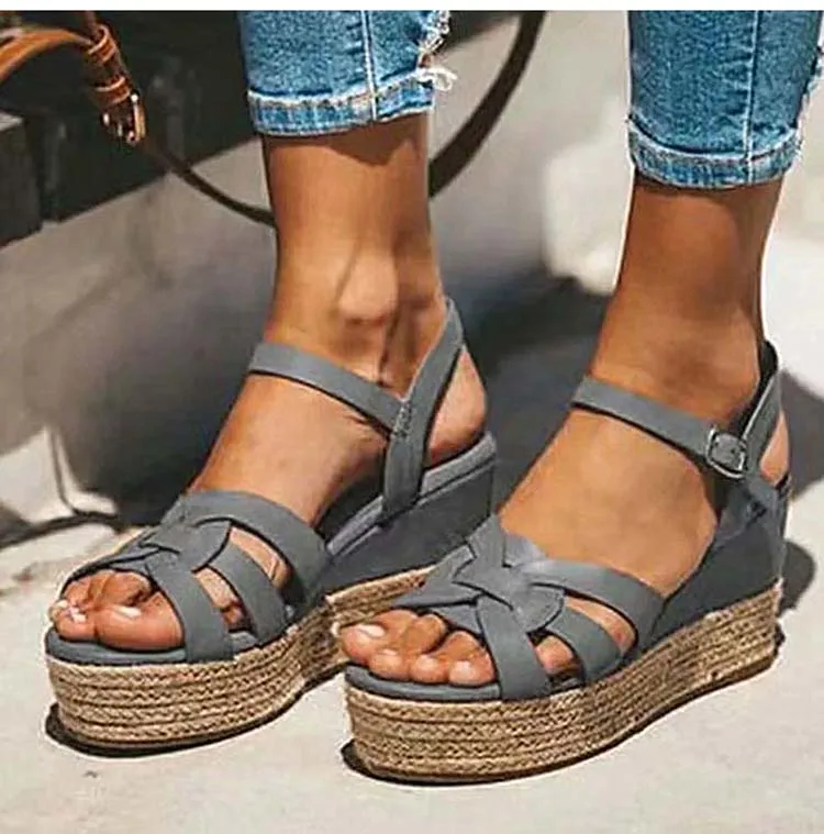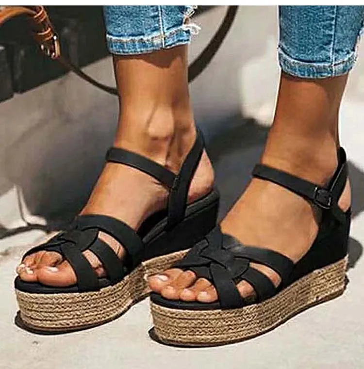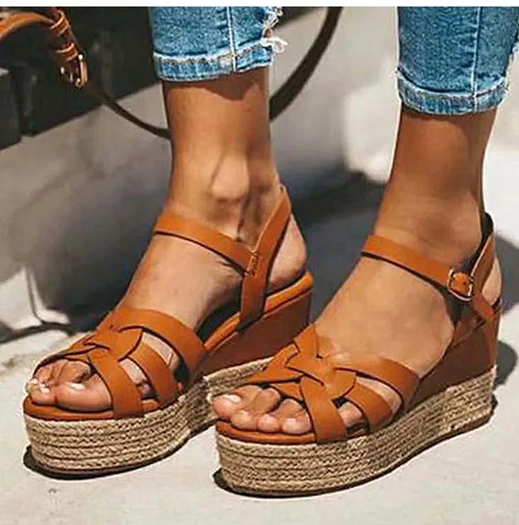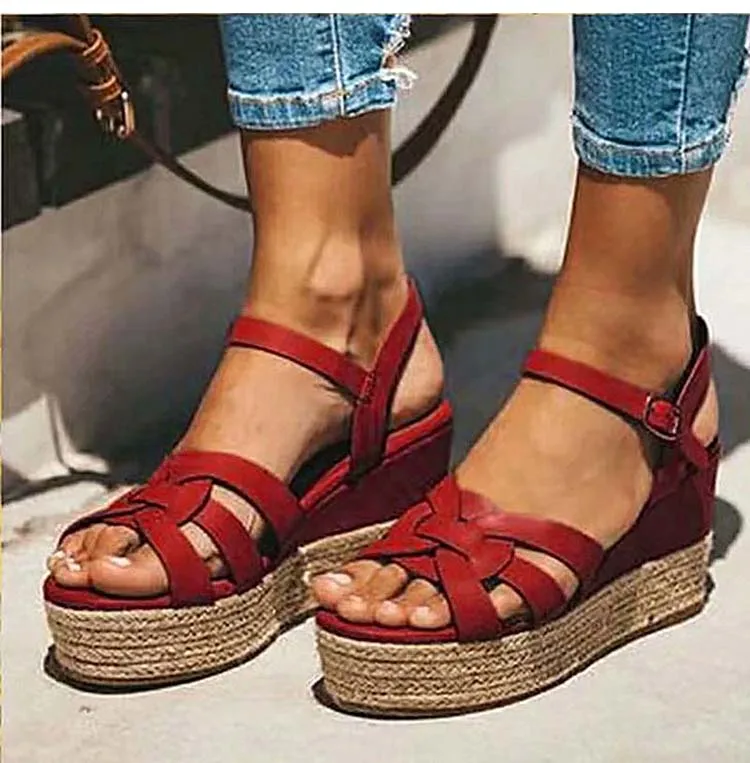 Женские босоножки в стиле «Гладиатор» Стиль клиновидной платформе соломенного цвета; Комнатные туфли на танкетке женские сандалии Для летних вечеринок, к платью; Женские туфли с пряжками размера плюс; Большие размеры 35-43