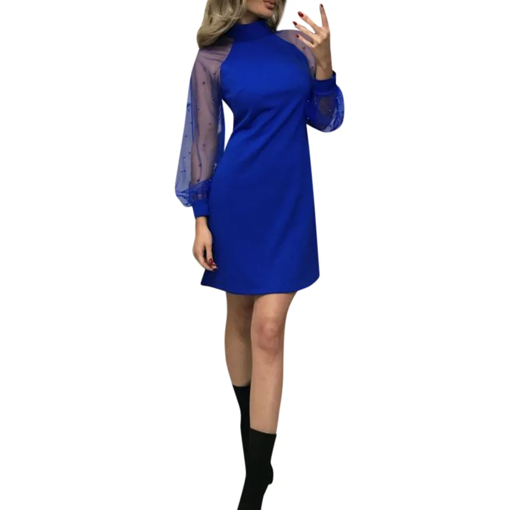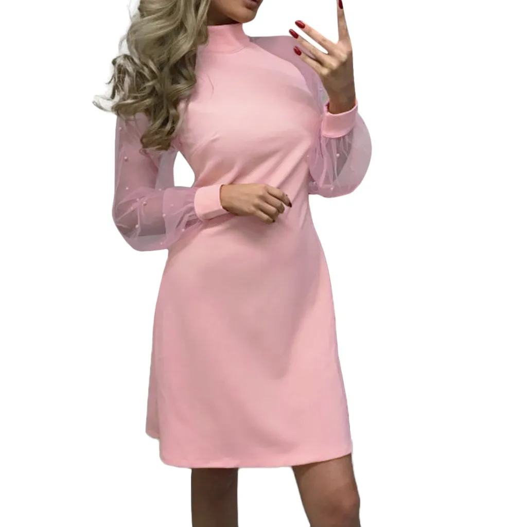 25 # Сетчатое платье с соединением внакрой для женщин с жемчугом и с высоким, плотно облегающим шею воротником с отделкой бисером; Платье с длинными рукавами; Рукав выполнен из сетчатой ткани с длинными рукавами и мини-платья трапециевидной формы вечерние платье Kobieta Sukienka