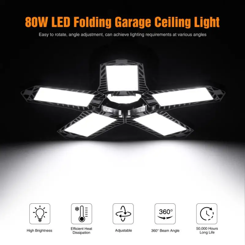 -Основные данные-супер яркий светодиодный гаражный свет с 5 сверхъяркими регулируемыми головками светодиодных ламп ABS-8000 Люмен, 6500K дневсветильник, CRI80 +, средний цоколь E26/E27, просто прикрутите, чтобы можно было использовать. Доступно для входного сигнала площади 85 в и 265 в, срок службы 50000 часов для вашего гаража, обеспечивая наилучшее освещение в помещении.