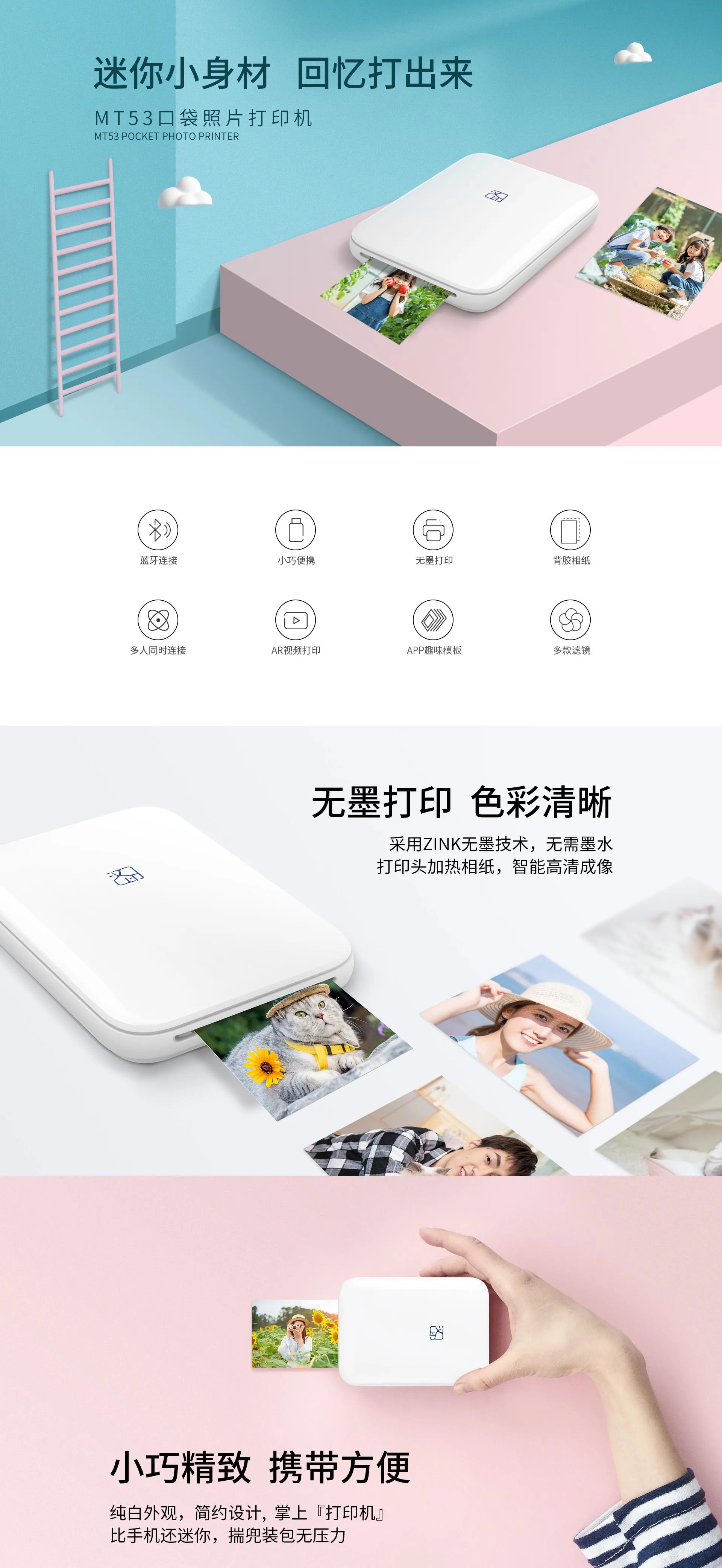 Название продукта: мини-фотопринтер Модель изделия: MT53 Способ связи: Bluetooth Метод печати: прямой тепловой, ZINK® Макс. Ширина печати: >50 мм Принт Скорость: ≥ 1,75 мм/сек. Печать одной фотографии в течение 45s Программное обеспечение: Android/iOS Разрешение: 313x600 DPI Интерфейс USB: USB устройство 2,0 Емкость аккумулятора: 500 мАч Порт зарядки: 5 В/2 А Размеры: 84x117x19мм Вес: 160 г