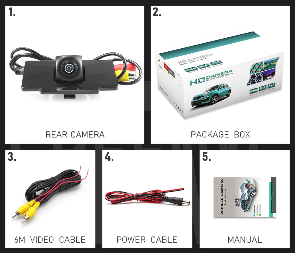 1. Задняя камера2. Коробка для посылка3. Видео кабель (6 м)4. Кабель питания5. Руководство пользователя