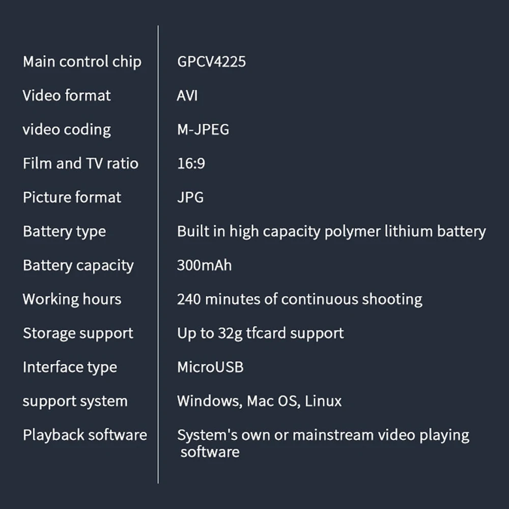ОписаниеОсновной чип управления: GPCV4225Разрешение видео: 480PФормат видео: AVIКодирование видео: M-JPEGСоотношение фильмов и телевидения: 16:9Формат изображения: JPGРасстояние Wi-Fi: 15 метровМикрофон: ВстроенныйДальность ночного видения: 2-3 метраТип батареи: встроенный литий-полимерный аккумулятор большой емкостиЕмкость аккумулятора: 300 мАчПоддержка хранения: до 32g tfcardТип интерфейса: MICROUSBСистема поддержки: Windows. Для Mac OS. Для Linux.Программное обеспечение для воспроизведения: собственные системы или Основное программное обеспечение для воспроизведения видео