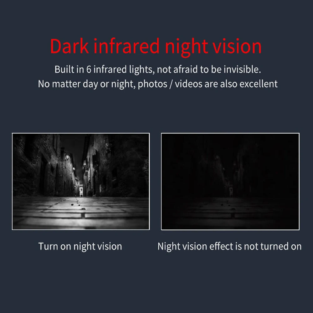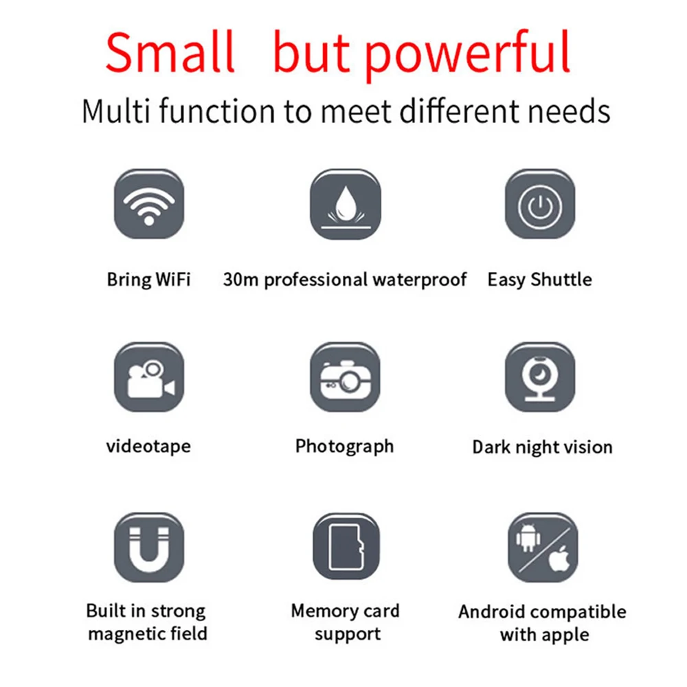 Особенности1. Подключение Wi-Fi: Поддержка Wi-Fi подключения, передача видео в режиме реального времени, вы можете использовать поток мобильных данных для управления камерой, вы также можете использовать управление Wifi. (Не поддерживает пульт дистанционного управления wifi)2. Управление приложением: приложение (для iPhone и Android) контролирует камеру для записи видео и фотографирования.3. Адсорбция магнита: Адсорбция магнита, износостойкая конструкция, может быть установлена на рюкзаки/одежду/брюки/двери/окна/стены, подходит для людей, семей, вождения и записи езды.4. Инфракрасное Ночное Видение: 6 инфракрасных ламп, мощный эффект ночного видения. -Маленький размер: маленький размер, портативный Портативный DV DC, подходит для различных случаев.5. Циклическая запись: нет необходимости удалять предыдущие видео.6. Аккумулятор: встроенный литий-ионный аккумулятор емкостью 300 мАч, время работы до 90 минут.7. Высокоскоростной интерфейс USB 2,08. Формат видео: AVI 640 × 4809. Режим изображения: JPG 640 × 480Упаковочный лист
