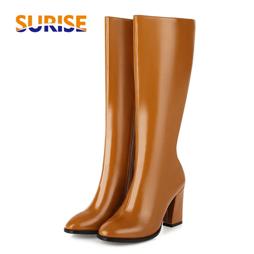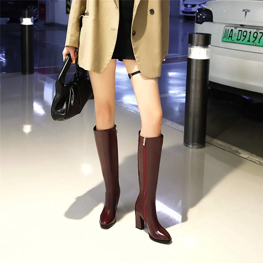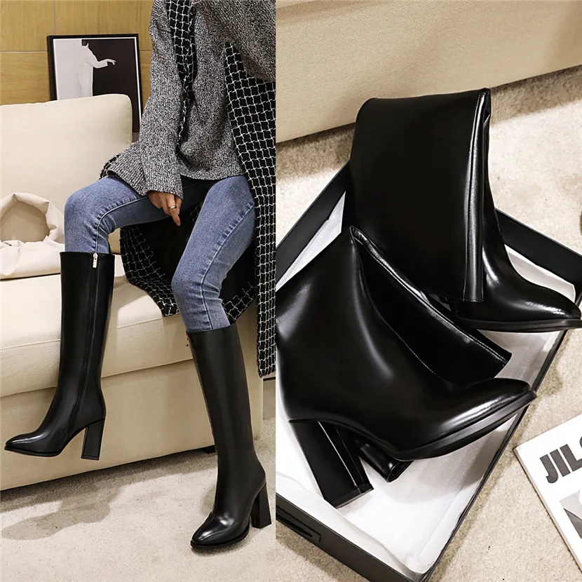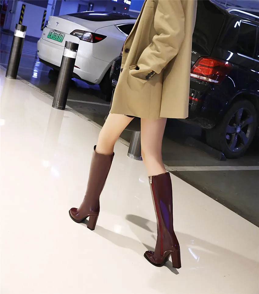 Зимние женские сапоги до колена; Цвет черный, красный; Качественные сапоги из искусственной кожи с круглым носком на квадратном каблуке; Клубные вечерние сапоги с высоким голенищем на молнии для деловой женщины; Большие размеры