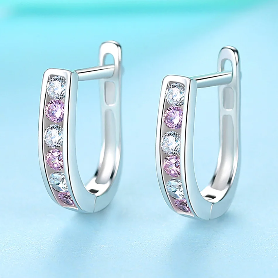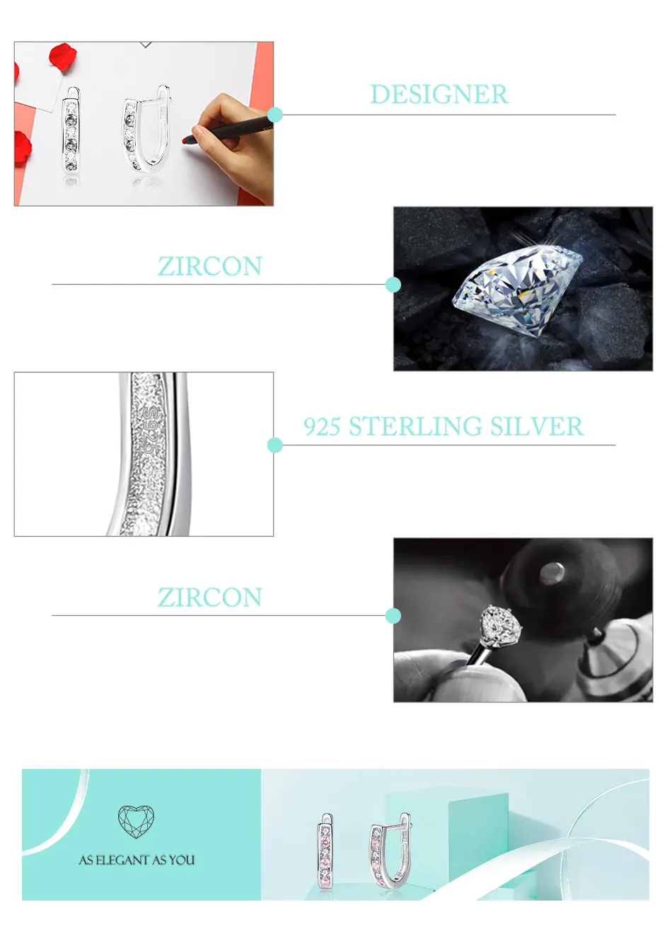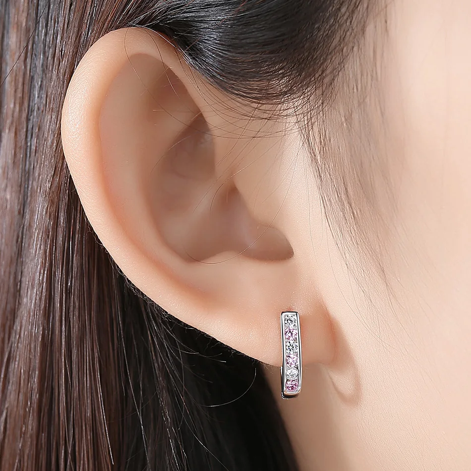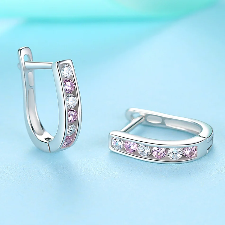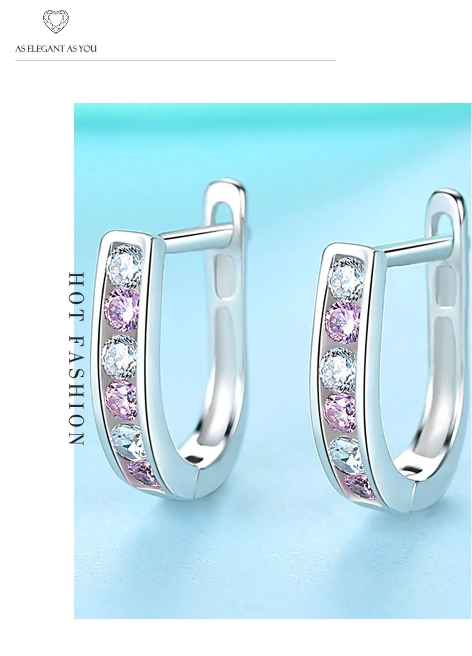 Настоящее серебро 925 пробы, розовые U-образные серьги-кольца с розовым прозрачным Хрустальная подкова, регулируемые серьги для женщин, ювелирное изделие