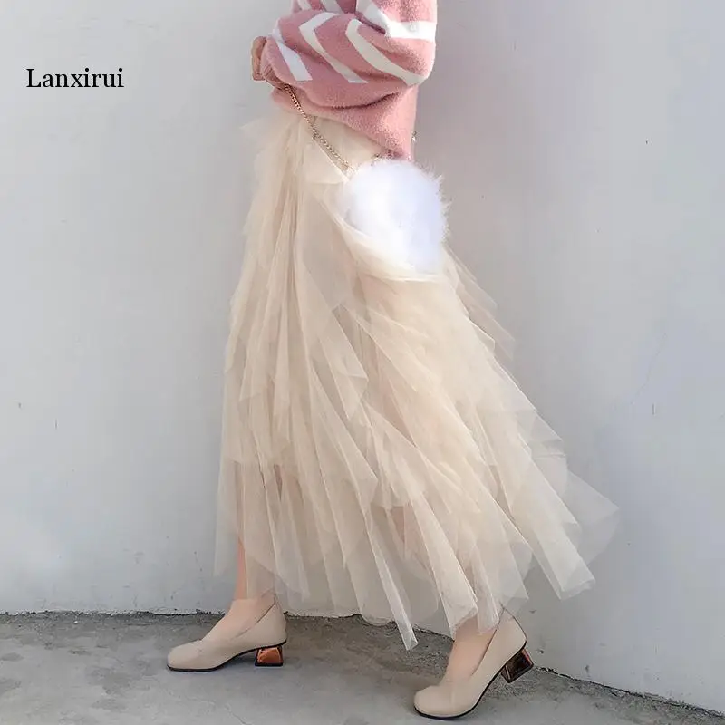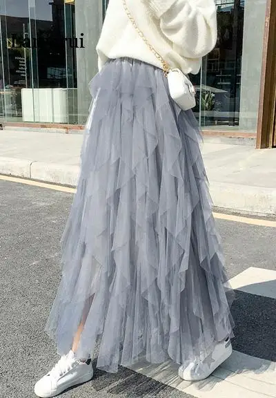 Модная Тюлевая юбка-пачка, Женская длинная юбка макси, Корейская черная розовая плиссированная юбка с высокой талией для женщин, весна 2020