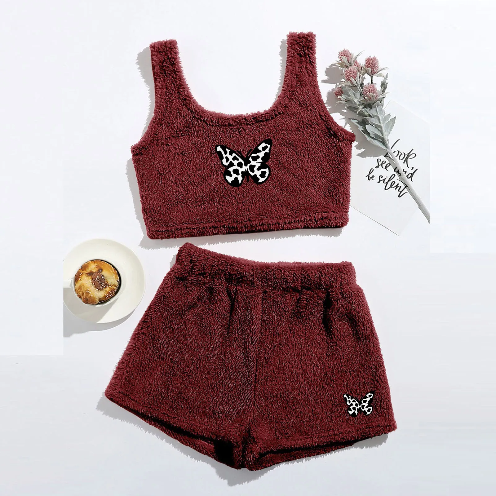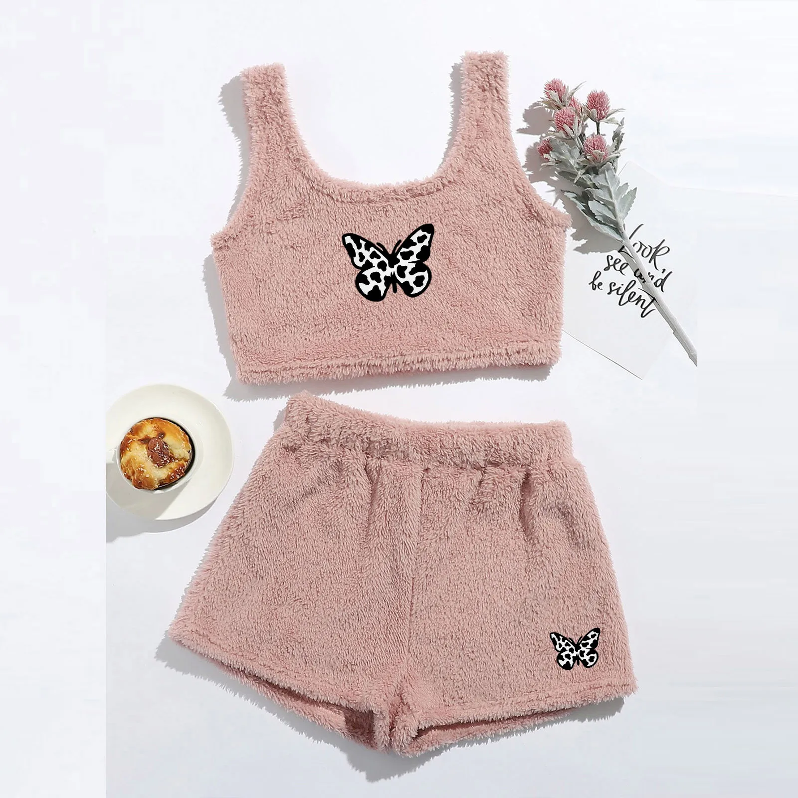 Женский пижамный комплект с принтом бабочки, фланелевый укороченный топ с круглым вырезом + шорты, теплый пижамный комплект на зиму, # T1G