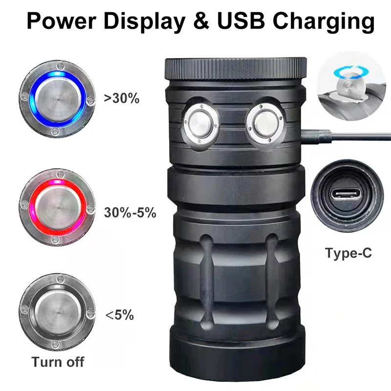 1. Бусины лампы: Индивидуальные COB лампы, индекс цветопередачи Ra90 +2. Яркость: 18000LM3. Напряжение: 3,7 V4. Диапазон: 250-450 м5. Встроенный аккумулятор: аккумулятор 3*21700, (14400 мАч)6. Светильник угол: 140 градусов7. Вес: 640 г (включая рычаг)8. Водонепроницаемость: IPX8 (Водонепроницаемость 100 м под водой)9. Размер: 132 мм * 60 мм/5,2 дюйма * 2,36 дюйма10. Режим зарядки: Зарядка Type-C (можно напрямую заряжать мобильный телефон)
