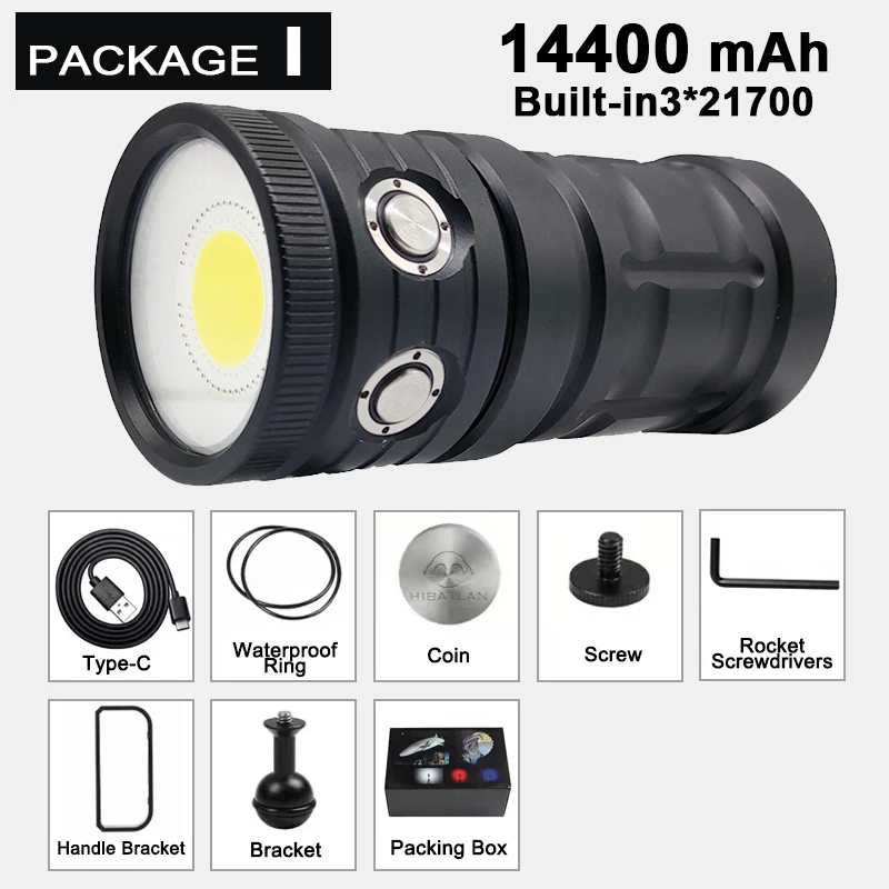 D10 фонарик для дайвинга (встроенный аккумулятор 3*4800 мАч 21700) + Type-C + водонепроницаемое кольцо + монета + винт + отвертки для ракеты + кронштейн для ручки + кронштейн + упаковочная коробка