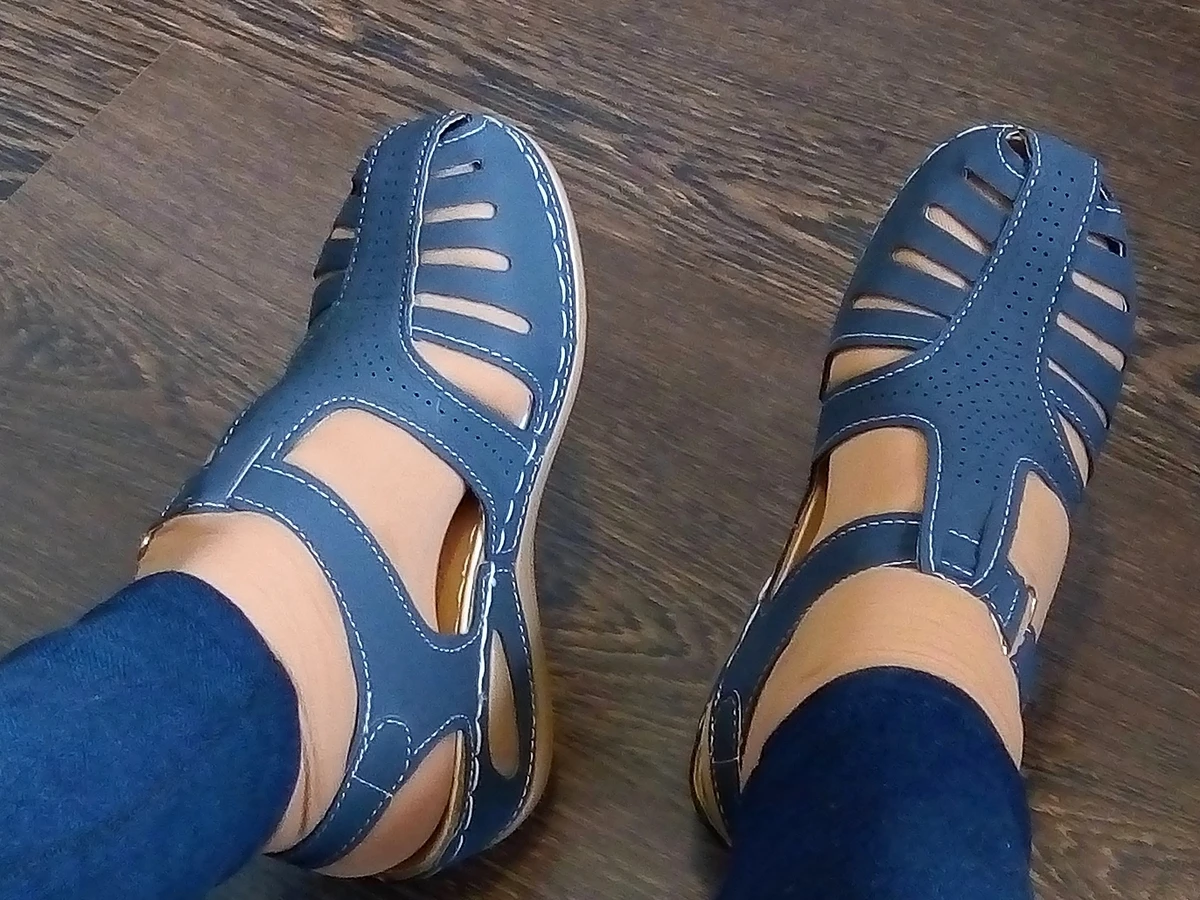 Сандалики отличные! Лёгкие, удобные и аккуратно пошитые. Обычно брала обувь на размер больше из-за широкой ноги и высокого взъёма, но уже 4-ю пару (летнию) беру здесь своего размера и довольна. Правда, застегнула с трудом, но разносила за день. На 22,5 см размер 35 отлично подошёл. Цвет не ярко-синий, а серо-синий, скорее джинсовый. Так что, девушка зря сняла звезду за цвет, мне он очень нравится. Пришли в совмещённой посылке за 3,5 недели.