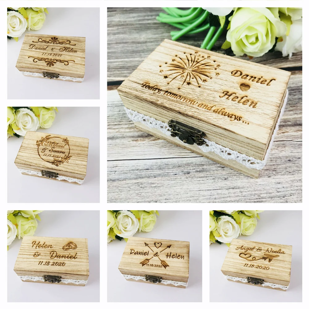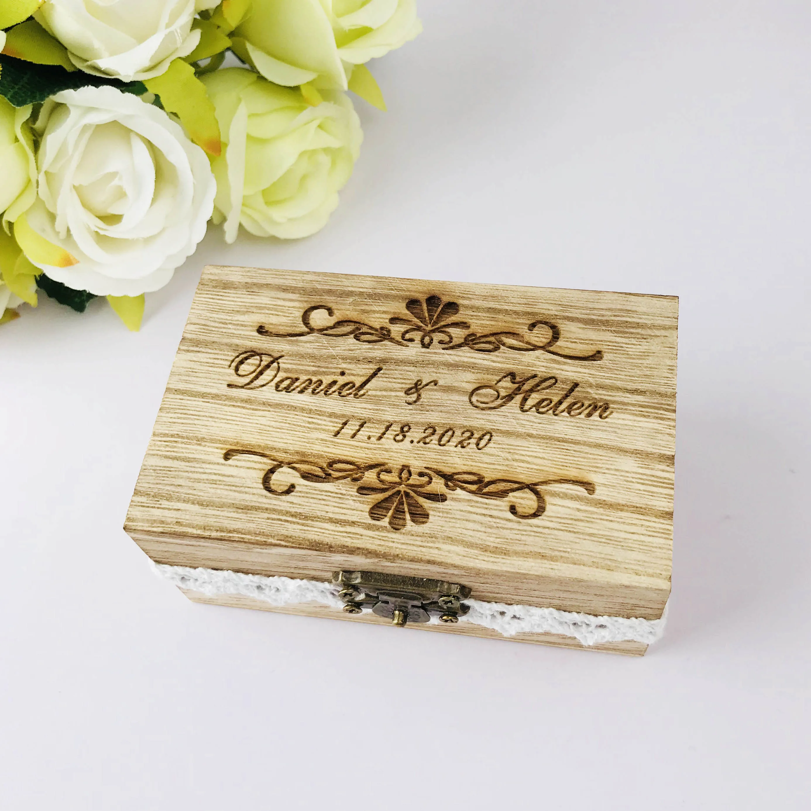 Персонализированная Коробка для колец деревенская свадьба, дерево, чехол для хранения сувениров с гравировкой имени и даты