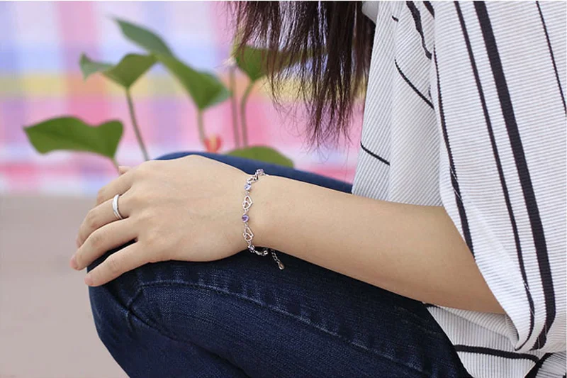 Высокое качество 925 стерлингового серебра браслет сердце фиолетового цвета с украшением в виде кристаллов циркон браслеты для женщин, вечерние, ювелирное изделие для помолвки подарок NY273