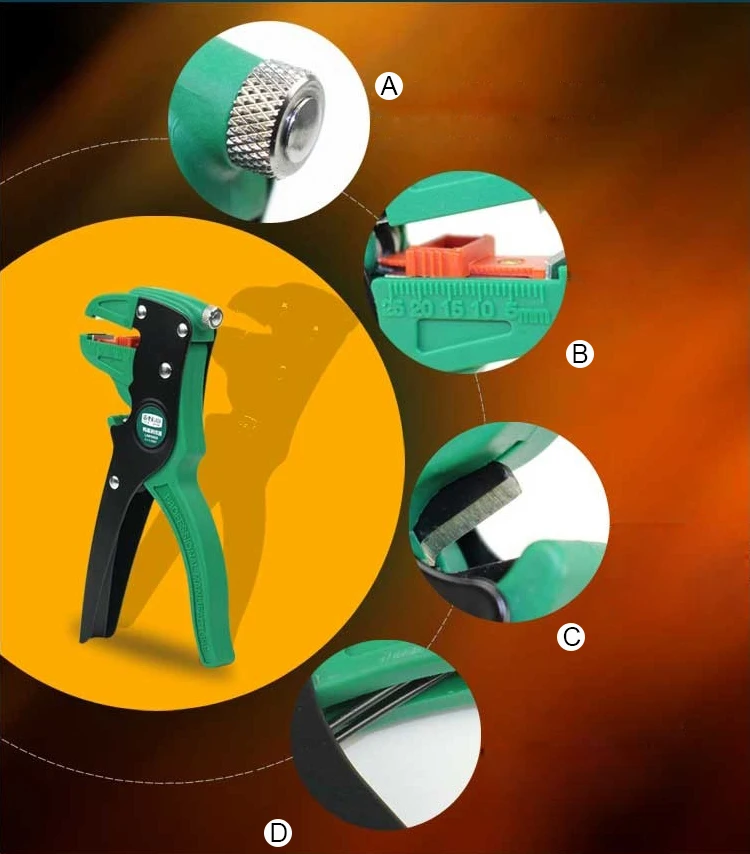 А. Кнопка регулировки переднего хода. Отрегулируйте диапазон силы. B. Кнопка регулировки длины зачистки. Отрегулируйте длину провода. C. Стрижка. SK5 Точная шлифовальная кромка, острый и прочный, подходит для резки мягкой проволоки, алюминия, меди. D. Энергетическая пружина. Энергосберегающая пружина с длительным сроком службы без искажений.