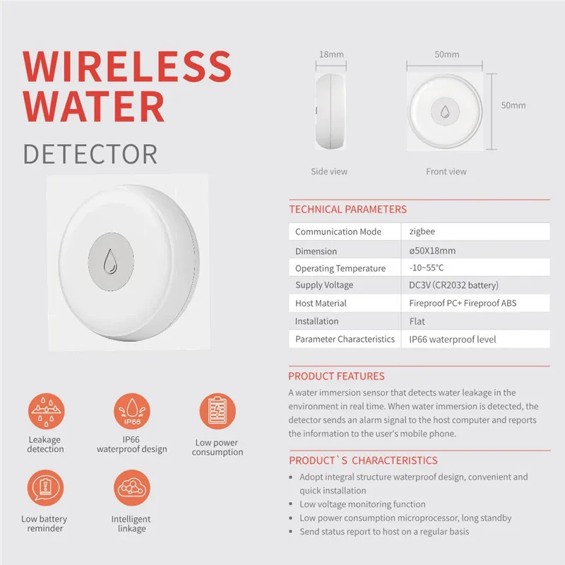 Примечание:Продукт должен использоваться с шлюзом ewelink zigbee и не может использоваться отдельно.Особенности:1. Обнаружение утечки воды. Шлюз удаленного уведомления для мобильного приложения.2. Простота в использовании и удобство.3. Покажите сигнал тревоги управления.4. История запросов.5. Мини портативный размер.Спецификация:Вход питания: DC3V (CR2032battery)Метод подключения: Zigbee 802.15.4Материал: PC + ABSОперационная система: IOS8.0/Android4.0 и вышеРазмер изделия: 50*50*18 ммВес брутто продукта: 60 гЦвет: белыйПосылка:1 * детектор уровня воды1 * Руководство пользователя