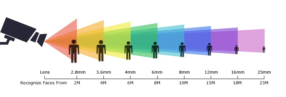 Меньшие Объективы известны как широкоугольные объективы, которые обеспечивают большее поле зрения, чем камеры с большим объективом. Они захватывают большую площадь, хотя объекты будут меньше в изображении камеры. Широкоугольные линзы предназначены для мониторинга больших площадей, таких как: 2,8 мм/3,6 мм-это большой угол, если вам нужен объектив 6 мм/8 мм/12 мм, вы можете связаться с нами