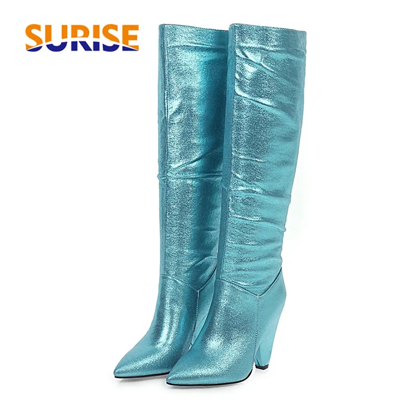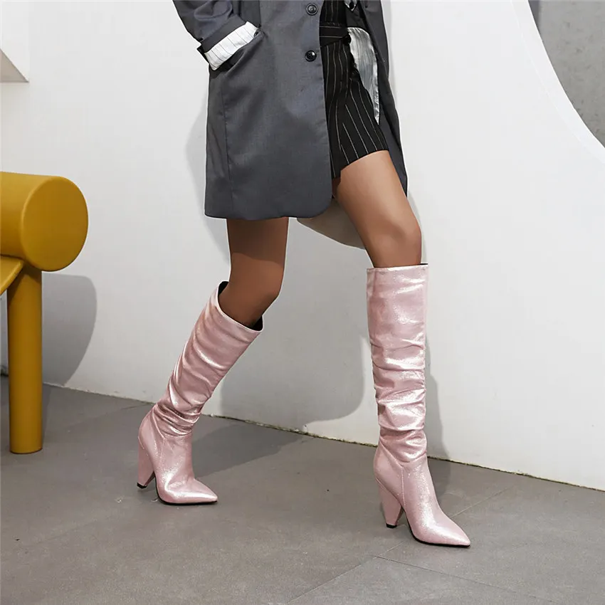Женские сапоги до колена с острым носком; Цвет серебристый, золотой; Блестящая микрофибра; Повседневная обувь; Обувь для офиса Женские зимние сапогиПлюшевые игрушкиВысокий блочный каблук; Цвет розовый, синийМодные плиссированные Шикарные Длинные слипоныБотинки