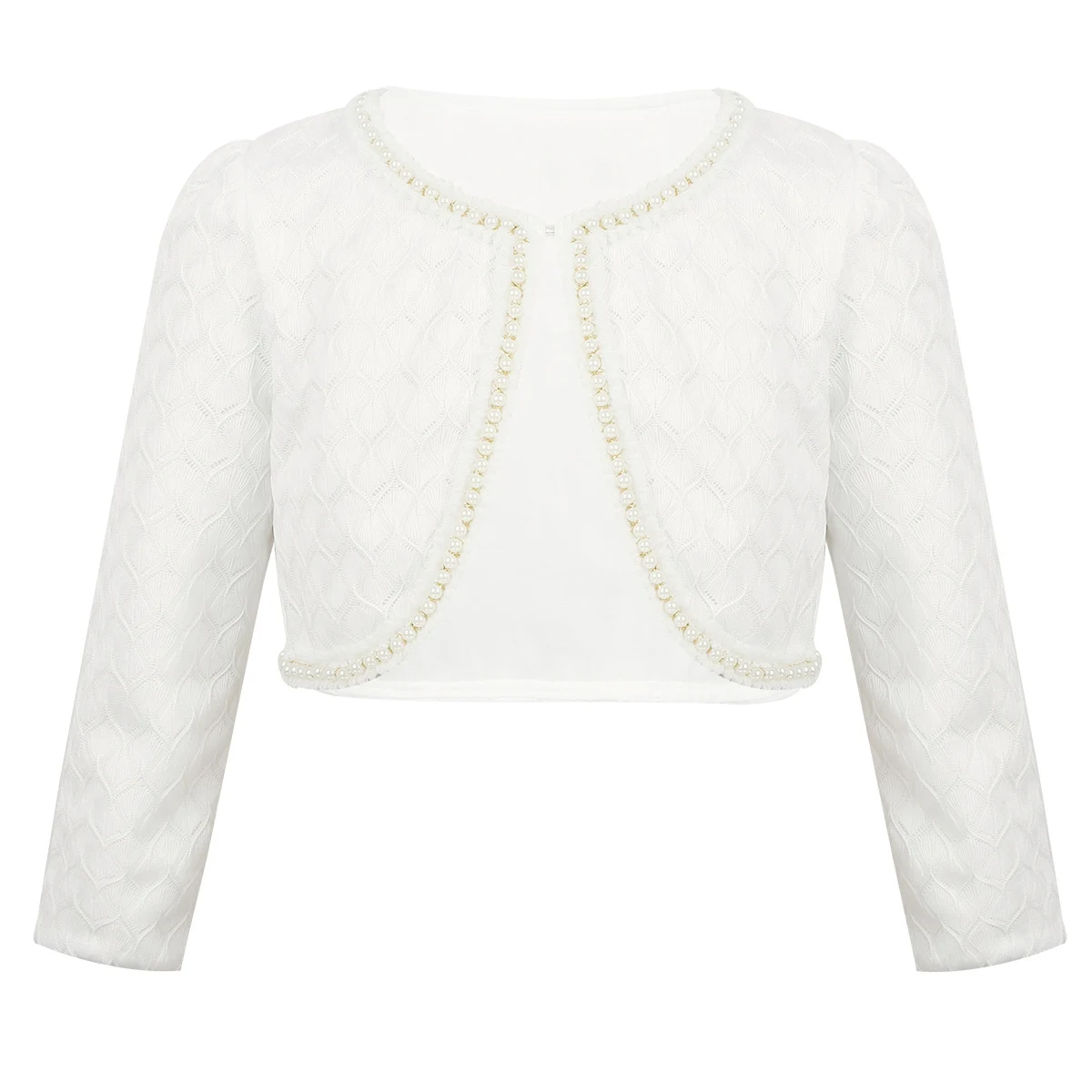 Белое Болеро для маленьких девочек с длинными рукавами, кружевом и бусинами, болеро, кардиган, топы, короткая куртка для дня рождения, свадебной вечеринки, платье с цветочным узором для девочек, 90-160