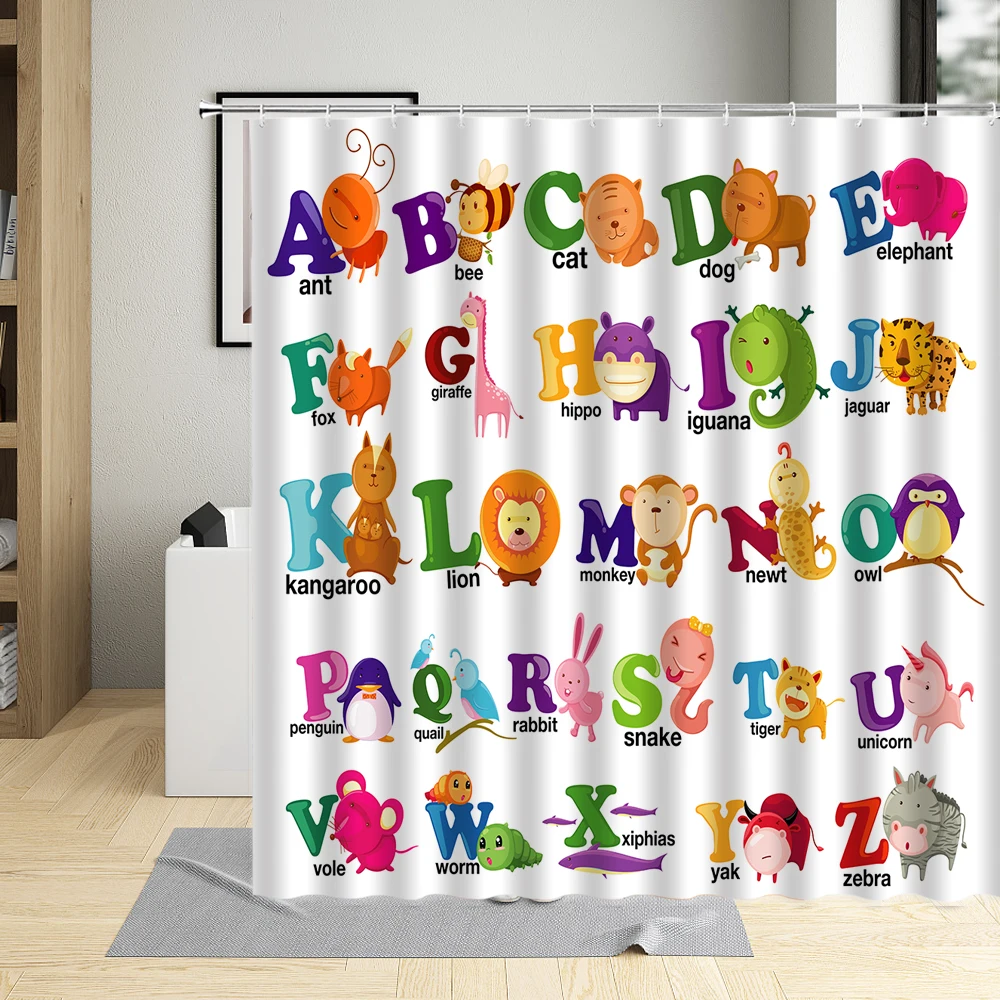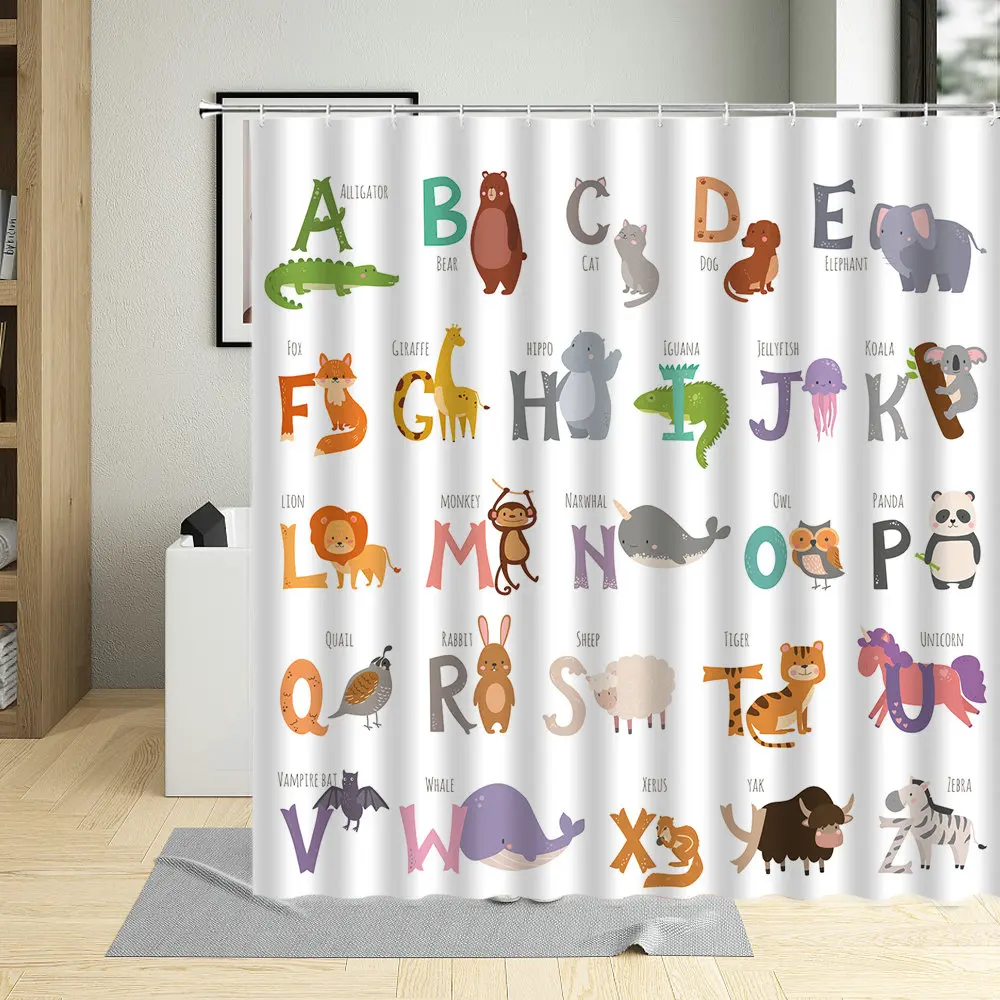 Занавеска для душа, водостойкая, с забавными мультяшными животными, буквами алфавита, с крючком