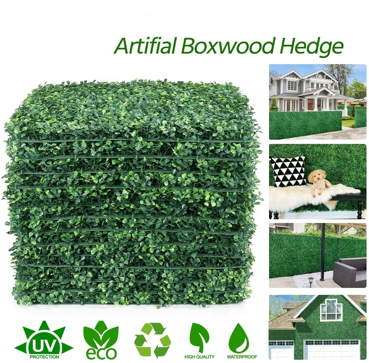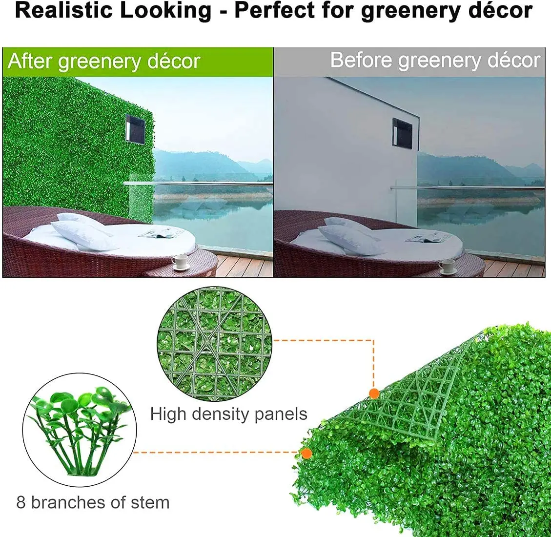 【Большой Размер 】 искусственные растения стены Boxwood хедж-коврики. Каждый Размер коврика 60X40X4CM/23,62 "x 15,75" x 1,57 ", поставляется с 308 растениями на каждой панели. 【Recyclable】наши искусственные изгороди сделаны из легкого, но сверхпрочного полиэтилена высокой плотности, который мягкий на ощупь. Экологически чистые и не выделяют токсичных химических веществ. 【Легко установить 】 можно легко прикрепить к любой деревянной раме или цепочке. (24) прилагаемые кабельные стяжки в комплекте. С помощью ножниц легко резать, помещать и формировать в любое пространство. Защелкивайте и блокируйте с помощью продуктов блокируя разъемы для легкой установки. 【Realistic & durable】реалистичный декоративный зеленый настенный самшит хедж-мат с реалистичными листьями HDPE на прочной пластиковой сетке, которая легко крепится к большинству конструкций. Зеленые панели экрана защищены от ультрафиолетовых лучей, устойчивы к атмосферным воздействиям, отлично подходят для внутреннего и внешнего использования, например, для уличного экрана, для наружного использования, для садового забора, для домашнего декора. Просто очистите садовым шлангом.