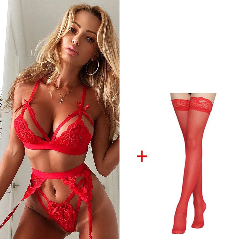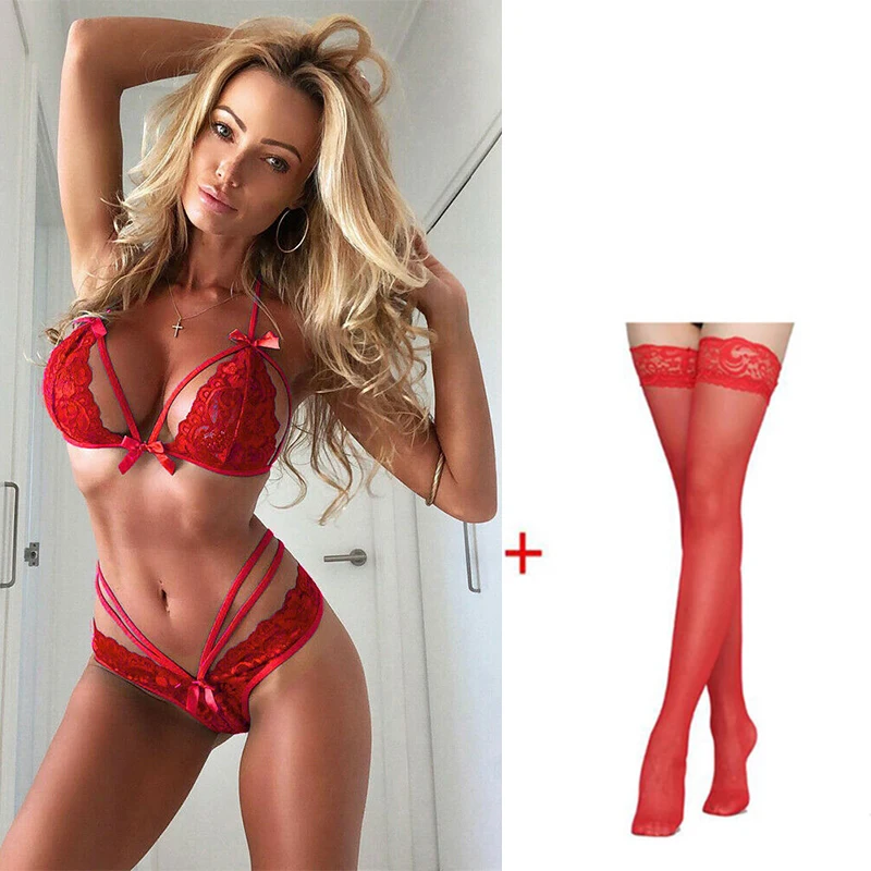 Кружевное женское сексуальное нижнее белье с открытой наборы бюстгальтер + трусы, эротическое Эротическое нижнее белье, бюстгальтер пуш-ап, красные чулки, стринги, прозрачный комплект нижнего белья