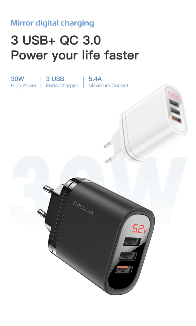 Зарядное устройство KUULAA с 3 USB-портами для быстрой зарядки, 30 Вт, мобильный телефон, для iPhone, Samsung, Xiaomi, QC3.0