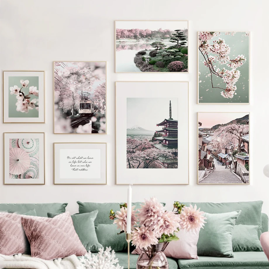 Японская Сакура, тарем, башня, деревня, розовая настенная Картина на холсте, скандинавские постеры и принты, настенные картины для декора гостиной