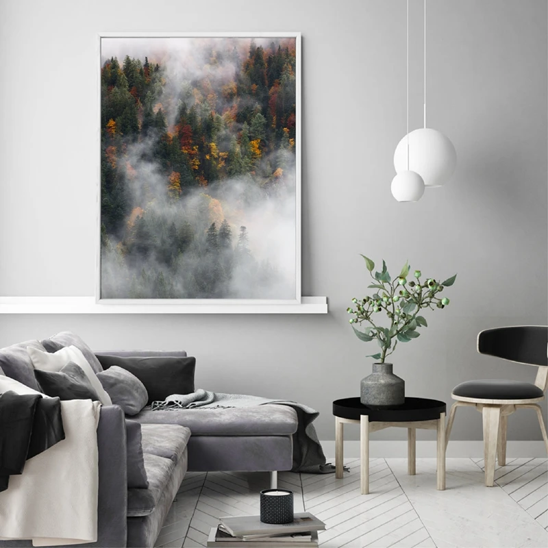 Фон для фотографирования с изображением туманной погоды и сосновых деревьев