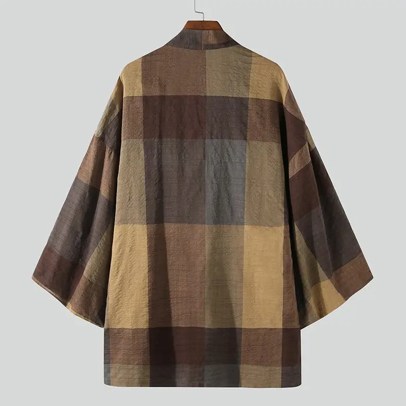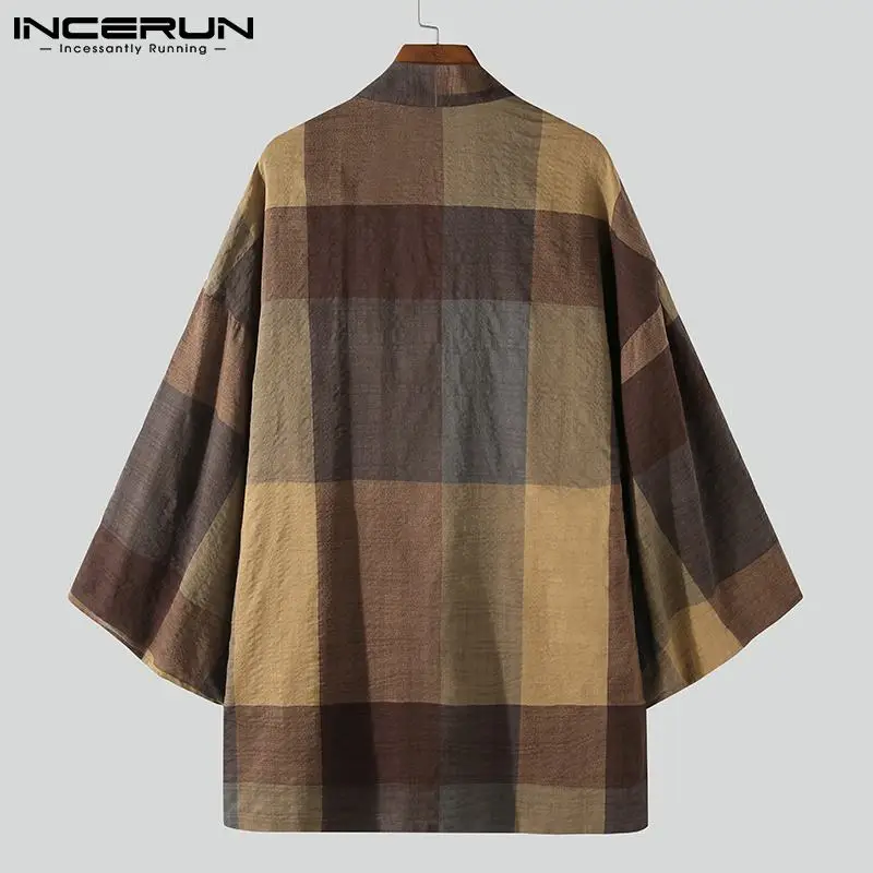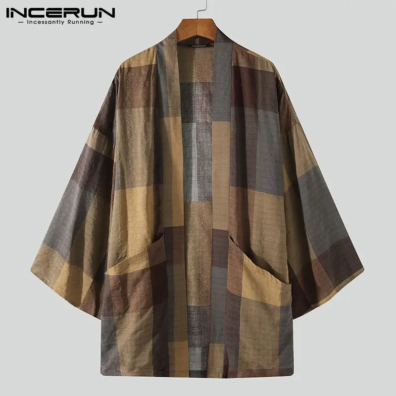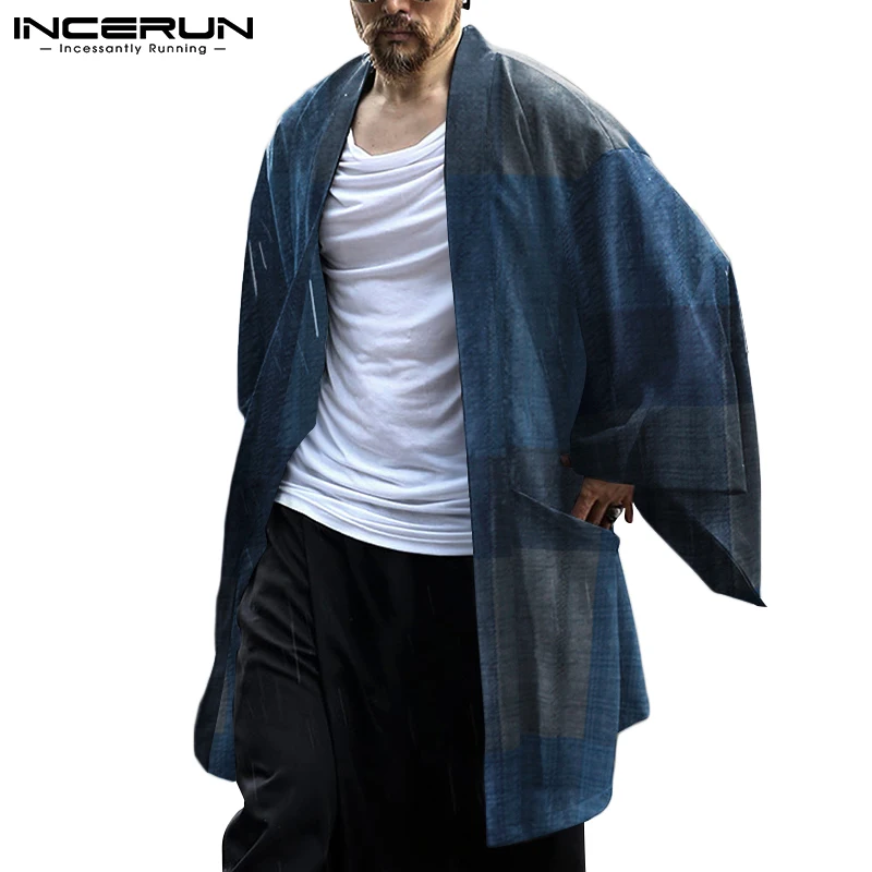 Кимоно INCERUN мужское в клетку с мужские рубашки с длинным рукавом, свободная уличная одежда с открытыми стежками и карманами, винтажный кардиган, длинная рубашка, S-5XL