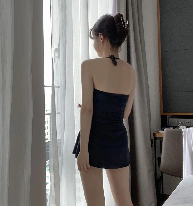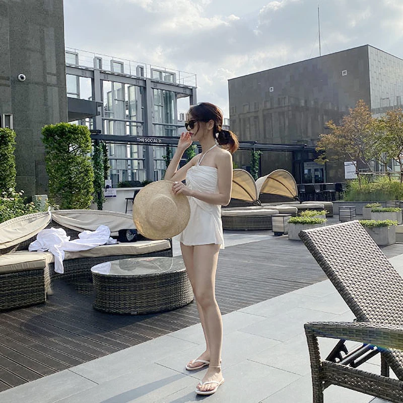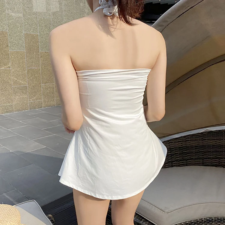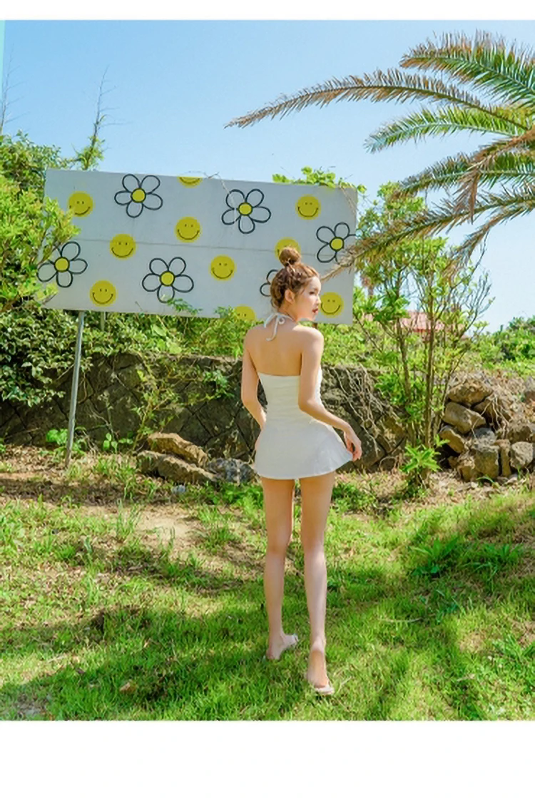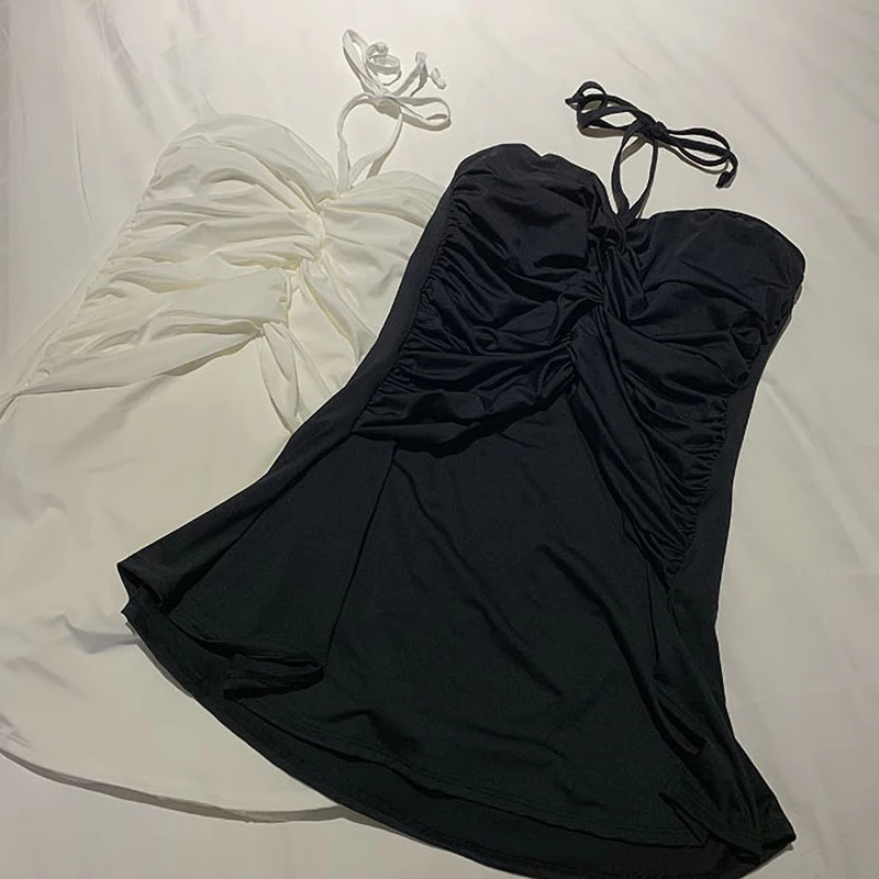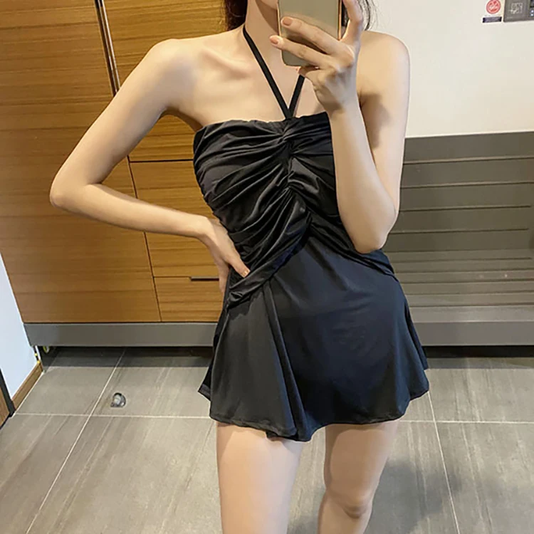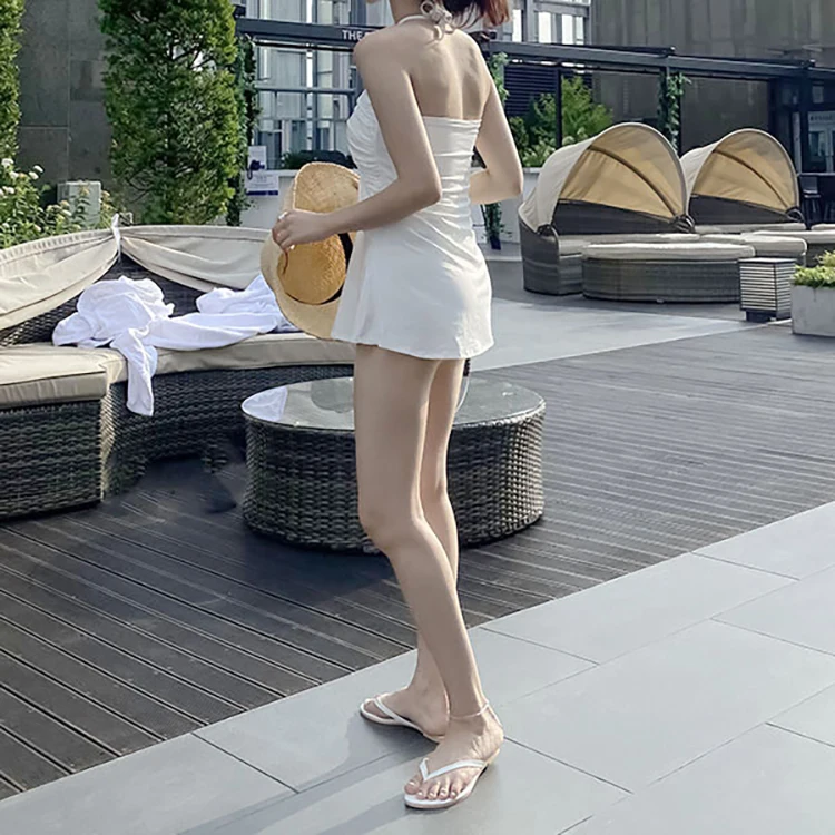 Женский однотонный Цельный купальник с лямкой на шее и оборками, Пляжное Платье в Корейском стиле, купальный костюм с мягкими чашечками