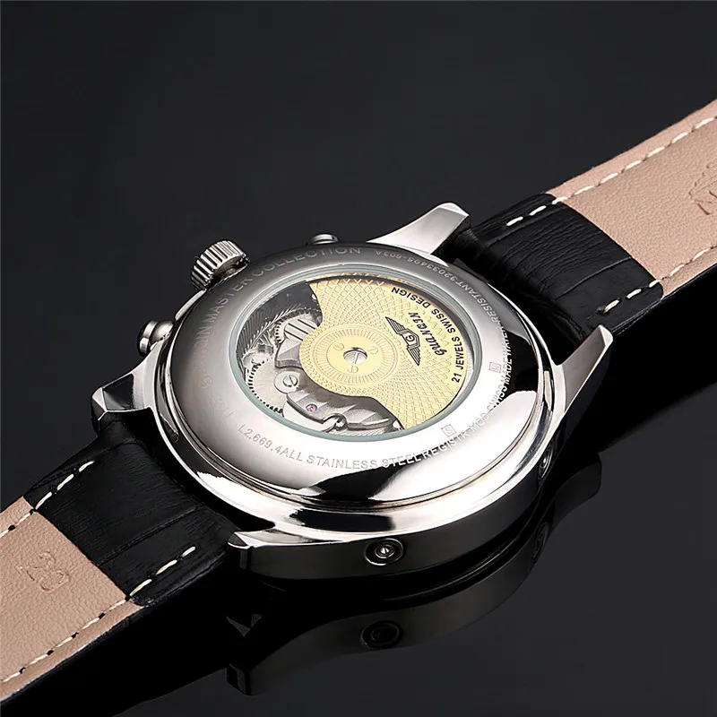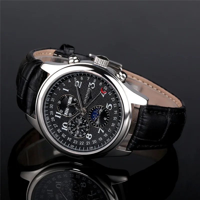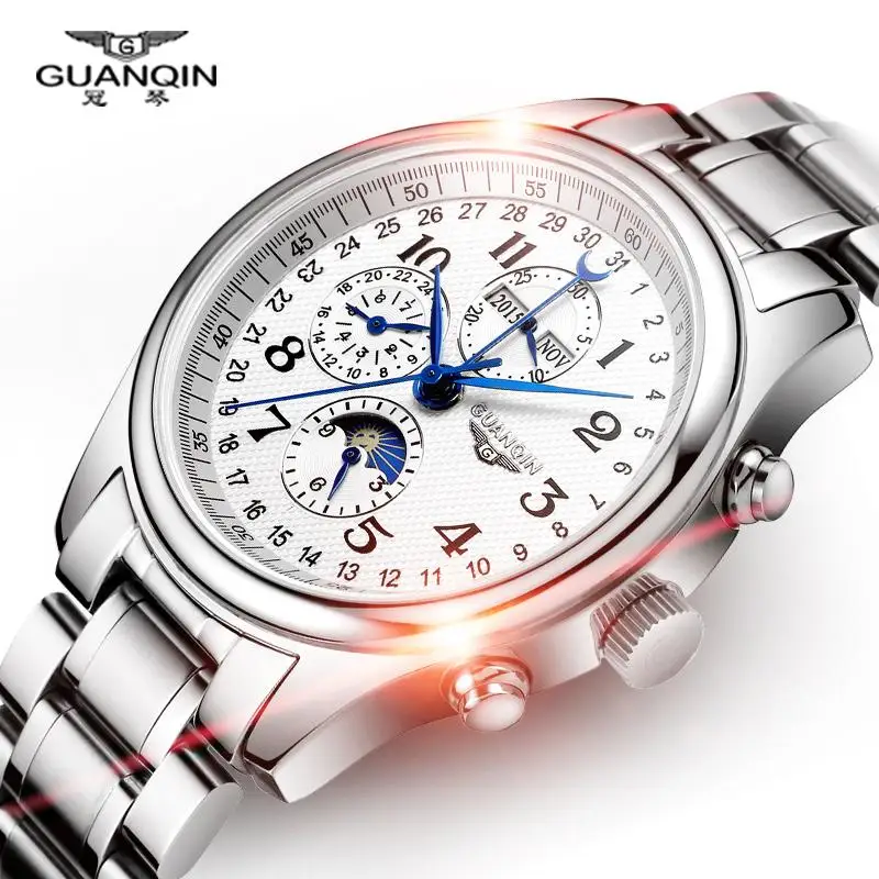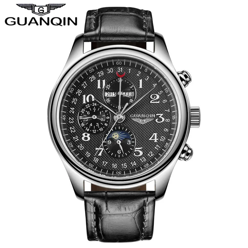 Автоматические мужские часы марки GUANQIN, механические мужские часы с сапфировым стеклом, водонепроницаемые мужские наручные часы с календарем и кожаным ремешком, мужские часы