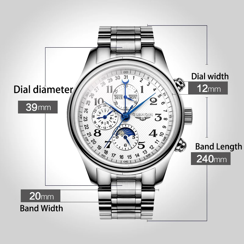 Инструкции по использованию 1.Все маленькие циферблаты часов могут работать нормально. 2. В первый раз, когда вы носите часы, вам нужно повернуть 30 кругов по часовой стрелке, чтобы обеспечить нормальную работу часов. 3. Когда время ношения составляет менее 8 часов или руки меньше качаться, энергии часов недостаточно, чтобы продолжать работать. 4. Отображение недели: из-за движения механической структуры часов. Циферблат недели продлевается, когда часовой стрелки отправляются на следующий день 3 или 4. И отрегулируйте циферблат недели, нажмите дважды. (Это ручное тестирование, есть разумные ошибки, пожалуйста, при условии фактической продукции). 5. Каждый из наших продуктов прошел водостойкий тест, и отбор проб стекла на устойчивость к царапинам производится на регулярной основе. Посылка: 1. Оригинальный продукт; 2. Гарантийный талон; 3. Руководство пользователя; 4. Оригинальная коробка; 5. Зеркальная ткань; 6.A инструмент
