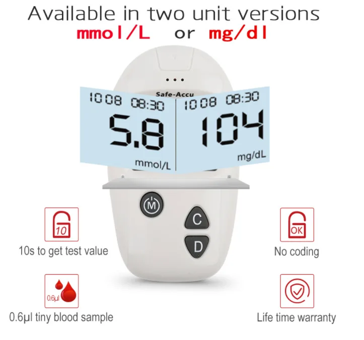 Muestra de sangre: sangre completa periférica fresca, sangre entera venosa Muestra de calibación: plasma venoso Rango de prueba: 20-600 мг/дл (1,1-33,3 ммоль/л) Tiempo de: 10s El volumen de la sangre: 0.6μl HCT: 30-60% Fecha de caducidad: 24 meses Memoria: 200 resultados de las pruebas Tipo de Bateria: CR2032 (sin pilas en el paquete) Por favor, presta atención a las diferencias del paquete y specciona el que quieras.
