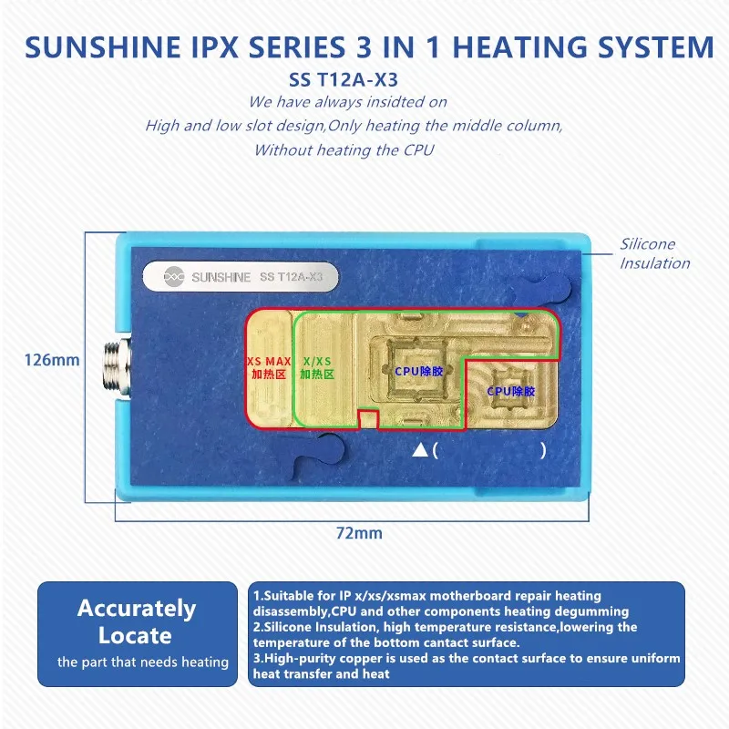 Принятие многослойного процесса 185 градусов для удаления IP-X материнской платы, не только из нашего тонкого анализа IP-X паяльной пасты, но и зависит от специальной конструкции нагрева и точного контроля температуры SS-T12A. SS-T12A нагревает только область, которую необходимо удалить IP-X для предотвращения неправильного нагрева. Двойной байонетный дизайн, убедитесь, что IP-X материнская плата стабильна на сцене. Медь высокой чистоты используется в качестве пленки для обеспечения равномерной теплопередачи и тепла. Профессиональные инструменты для ремонта материнской платы iPhone X для iPhone 6, 7, 8, X, XS MAX, отсоединяемая материнская плата с различными нагревательными пазами для материнской платы iPhone. SUNSHINE SS-T12A имеет штепсельную вилку EU, AU и US, 110 В или 220 В для выбора бесплатно. SUNSHINE SS-T12A iPhone X верхняя/Нижняя материнская плата пред-нагревательная станция принимает специальную конструкцию отопления и точную возможность контроля температуры, которая точно определит местонахождение необходимой нагревательной части. SS-T12A имеет двойной байонетный дизайн, чтобы сделать материнскую плату iphone X стабильной. SUNSHINE SS-T12A имеет штепсельную вилку ЕС, Австралии и США, 110 В или 220 В на ваш выбор. Использование меди высокой чистоты для гарантии теплопередачи, которая не легко деформируется, прочный и анти-износ 100V-240V SS-T12A iPhone X материнская плата многослойный 185 градусов Точная быстрого разделены разборки Отопление Паяльная Станция Логическая плата iPhone X была сложена пополам, два слоя затем были спаяны вместе, верхний слой-материнская плата, а нижний слой-Сигнальная плата. Что значительно затруднило наш ремонт, как быстро и эффективно отремонтировать логическую плату iPhone X, нужны профессиональные инструменты для ремонта материнской платы iPhone X