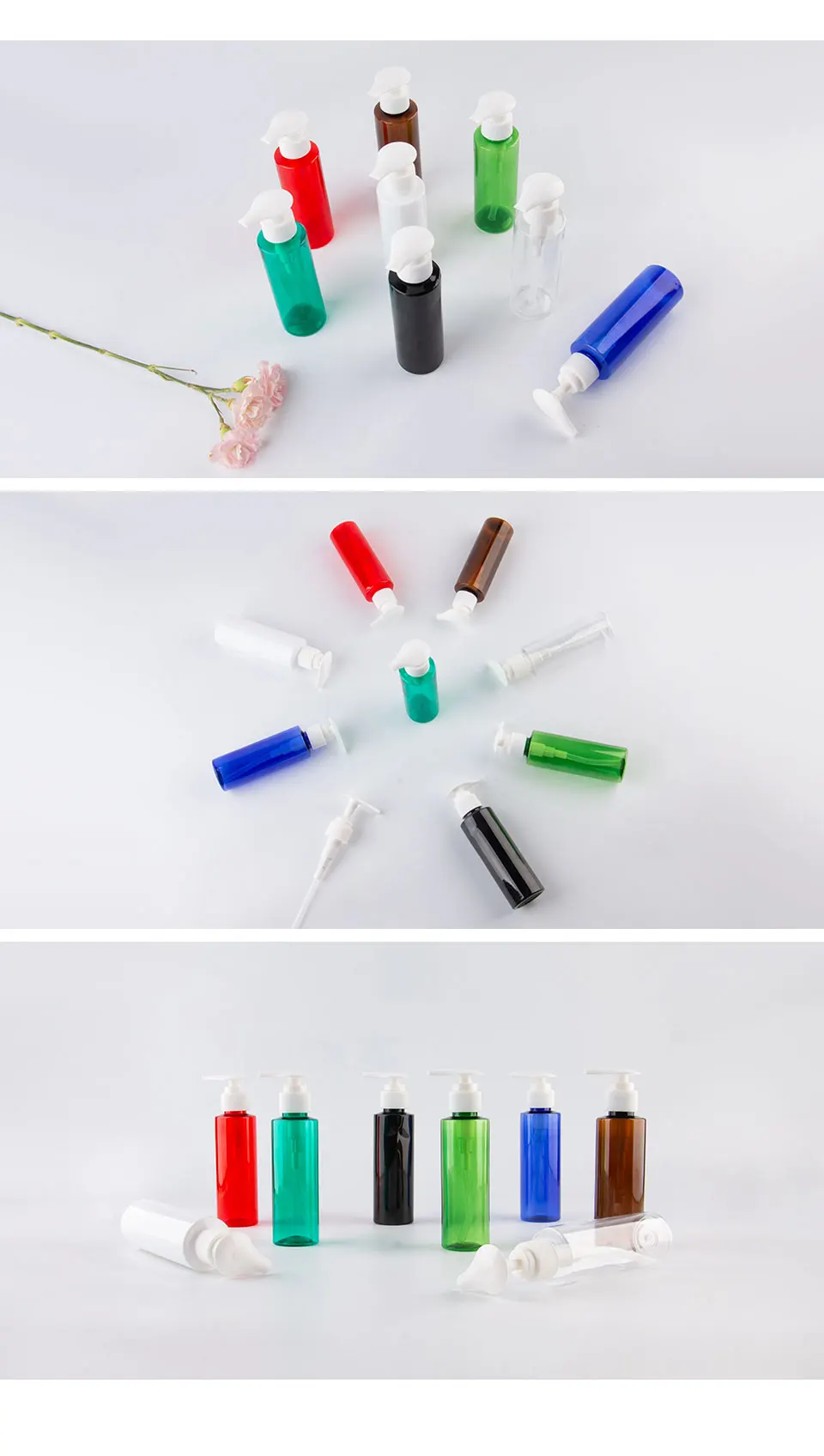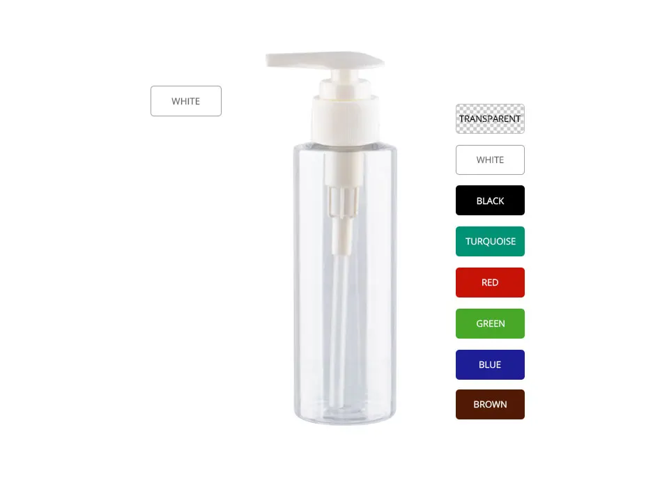 Емкость: 120 мл Размер: 41x149 мм Материал: ПЭТ + ПП Цвет: прозрачный/белый/зеленый/красный/синий/коричневый/черная бутылка + белый насос