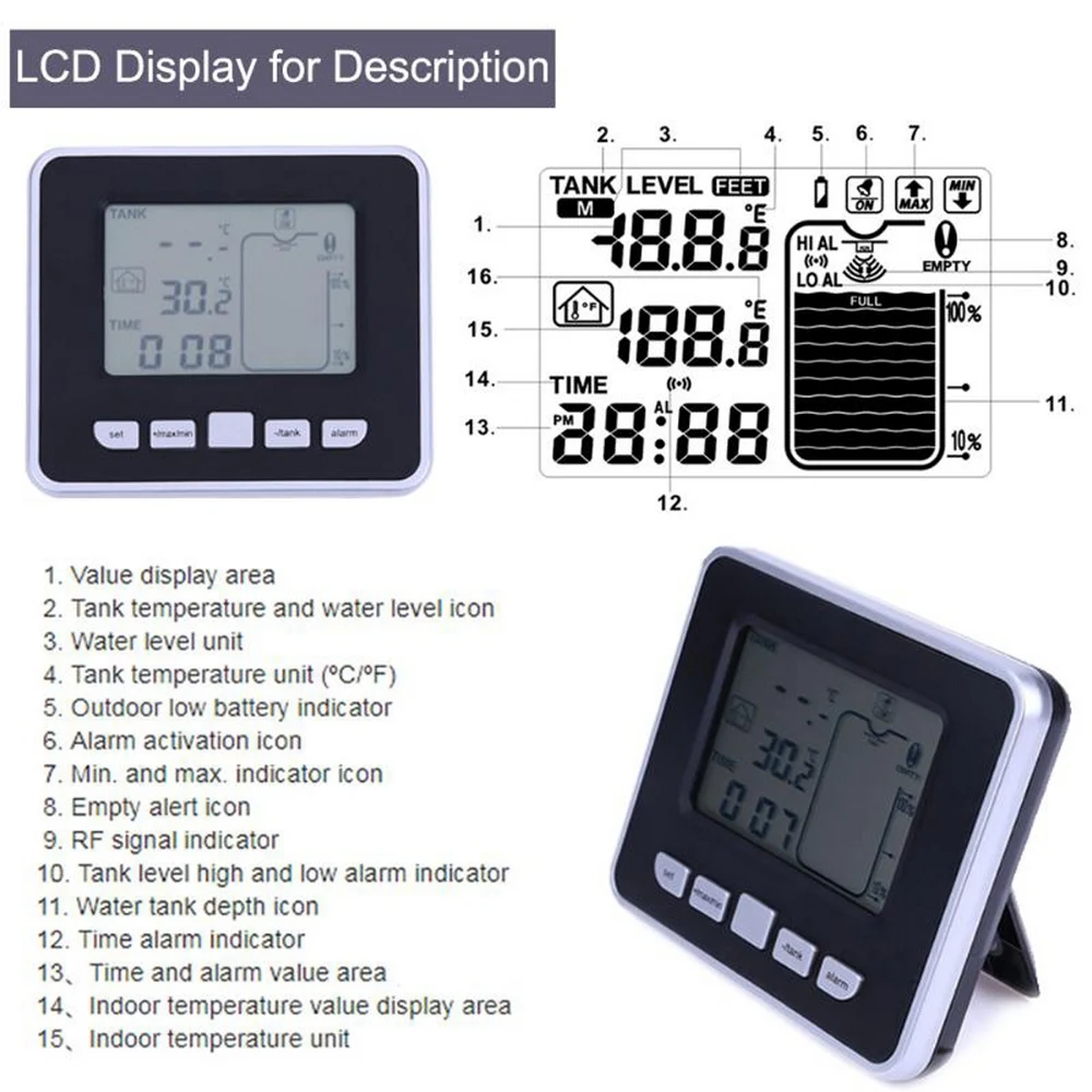 1. Счетчик контролирует глубину резервуара для жидкости и отображает гистограмму из 10 элементов 2. Может сохранять Минимальный/максимальный уровень жидкости в резервуаре 3. Поддержка высоких/низких резервуаров и пустой резервуар для жидкости 4. Одновременное отображение температуры в помещении (° или °) и температуры резервуара для воды (° или °) 5. Приемник можно разместить на столе или повесить на стену. Спецификация: Тип: ультразвуковой датчик уровня Дальность передачи: до 100 метров (на открытом пространстве) Частота: 433 МГц Диапазон температур в помещении: -50 °-0 Разрешение: 1 ° Точность: ± 1 ° Диапазон измерения температуры резервуара для воды: -40-60 ° Разрешение: 1 ° Точность: ± 1 ° Диапазон измерения уровня воды: 0-15 м Разрешение: 0,01 м Точность: ± 0,03 м Продолжительность будильника: 120 секунды Потребление энергии: Внутренний приемник: 2 батарейки AA 1,5 В (не входят в комплект) Передатчик топливного бака: 6 батареек AAA 1,5 В (не входят в комплект) Размер: 16,5*11*10,5 см Вес: 288 грамм Посылка входит: 1 * внутренний ЖК-приемник 1 * Датчик уровня воды 1 * Монтажный винт 1 * Инструкция по эксплуатации Примечание: 1. Внимательно наблюдайте за внешним резервуаром для воды в комфортной гостиной на расстоянии 100 м от себя. 2. Передатчик устанавливается в верхней части резервуара для воды с помощью ультразвукового датчика для измерения уровня воды и теплового датчика для измерения температуры. 3. Вы можете повесить приемник на стену или вынуть кронштейн, а затем поставить на кухонный верстак, стол или стол. 4. Проверьте температуру в помещении, температуру резервуара для воды и уровень воды (представлен гистограммой из 10 элементов).5. Вы можете хранить минимальные/максимальные записи и устанавливать сигналы тревоги для определенного уровня воды (Высокий/Низкий) или когда нет.