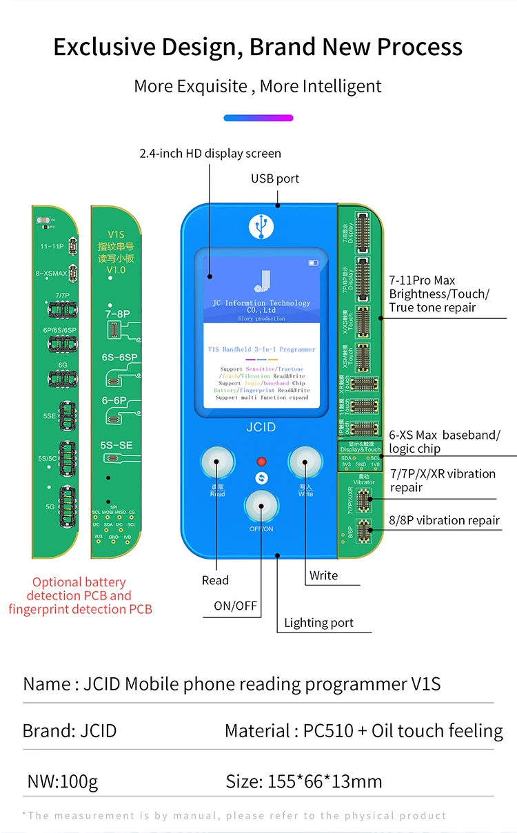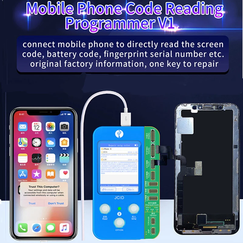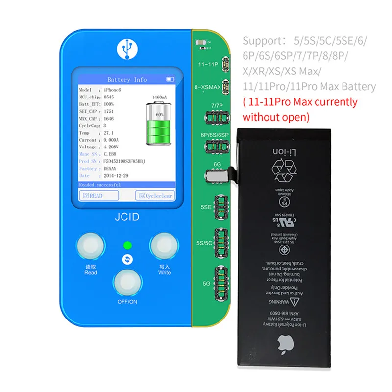 Полный комплект включает: Хост + Панель батареи + плата для отпечатков пальцев + 7-11prmax ЖК-плата + 12-12promax ЖК-плата + Лицевая идентификационная плата + наушникФункция сброса батареи, некоторые модели не могут быть завершены, подскажет ремонт и другие слова, такой мобильный телефон не может быть очищен, если вы возражаете, пожалуйста, не покупайте егоJC V1S, V1 не является универсальным, не является универсальной зеленой платой, JC считывание и запись отпечатков пальцев может использоваться только последняя клавиша отпечатков пальцев JC1 чтение и резервное копирование: клип соединитель ваших оригинальных частей к JC V1 в соответствии с моделями, нажмите кнопку чтения, данные были сохранены в чип памяти здания.2. Написание: соединитель зажима ваших запасных частей к JC V1 в соответствии с моделями, нажмите кнопку записи, сохраненные данные будут удалены на запасные части от чипа памяти здания.