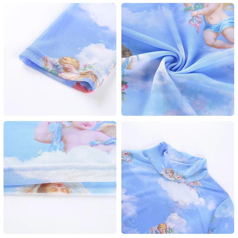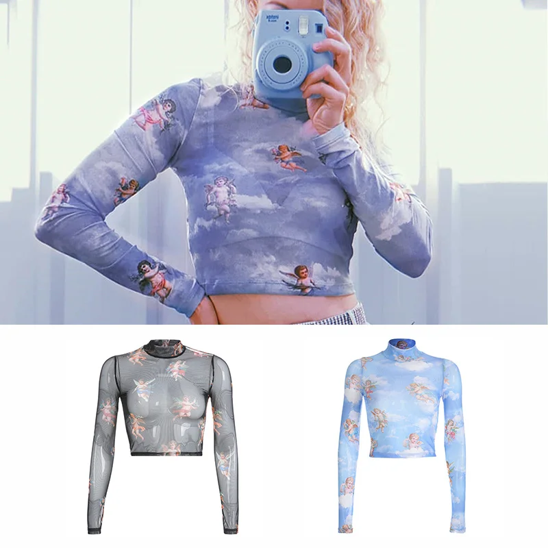 Сексуальная черная Синяя женская футболка, топ, прозрачная сетчатая рубашка с длинными рукавами и принтом ангела, Женский облегающий универсальный топ для девочек