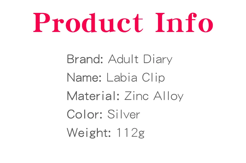 Спецификация: Пол: женский Материал: цинковый сплав Цвет: серебристый Размер: регулируется по размеру Вес: 112 г Особенность: регулируемая, Эротическая форма Функция: Стимуляция клитора для женщин, игра для пар, игры для взрослых Посылка: Секретная доставка, хорошая защита конфиденциальности Комплектация: зажим для половых губ 1 шт.