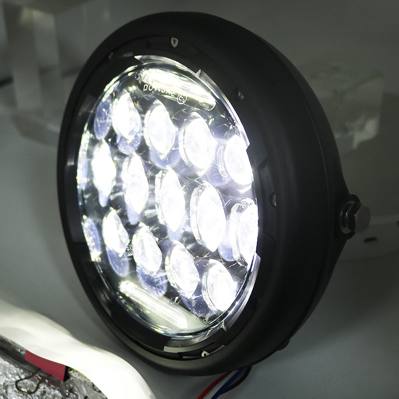 Название товара: 7-дюймовый светодиодный налобный фонарь в стиле ретро для мотоцикла Материал: алюминиевый сплав + передняя крышка стекла Источник освещения светодиодный Потребляемая мощность: ближний свет 15 Вт, дальний свет 40 Вт, ДХО 8 Вт Напряжение: 12 В-24 В Цвет внешнего кольца: черный Цвет DRL: белый Светильник: прибл. 7 дюймов Гарантия: 1 год