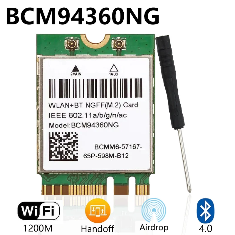 Описание:Модель: BCM94360NG/BCM94360;Характеристики: macOS plug and play;Интерфейс: NGFF, M.2;Класс устройства: 802.11ac/a/b/g/n;Скорость до 867 Мбит/с (5 ГГц), 300 Мбит/с (2,4 ГГц);Двухдиапазонный: 2,4 ГГц/5 ГГц;Bluetooth: BT 4,0;Система поддержки: Windows 7/8/8.1/10 и macOS, Hackintosh.Поддержка Handoff и airdrop;Размер: 22*30 мм.