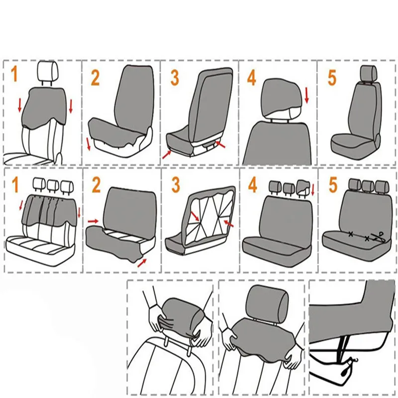 9 шт./компл. (переднее сиденье и заднее сиденье):5 * Крышка для стула: 27x26 см2 * крышка переднего сиденья: передняя спинка: 72x55 см/переднее сиденье: 59 * X60 см1 * заднее сиденье: 125х60 см1 * Задняя стендовая спинка: 115х53смАксессуары: включает в себя пакет крючков, пакет из 25 шт.
